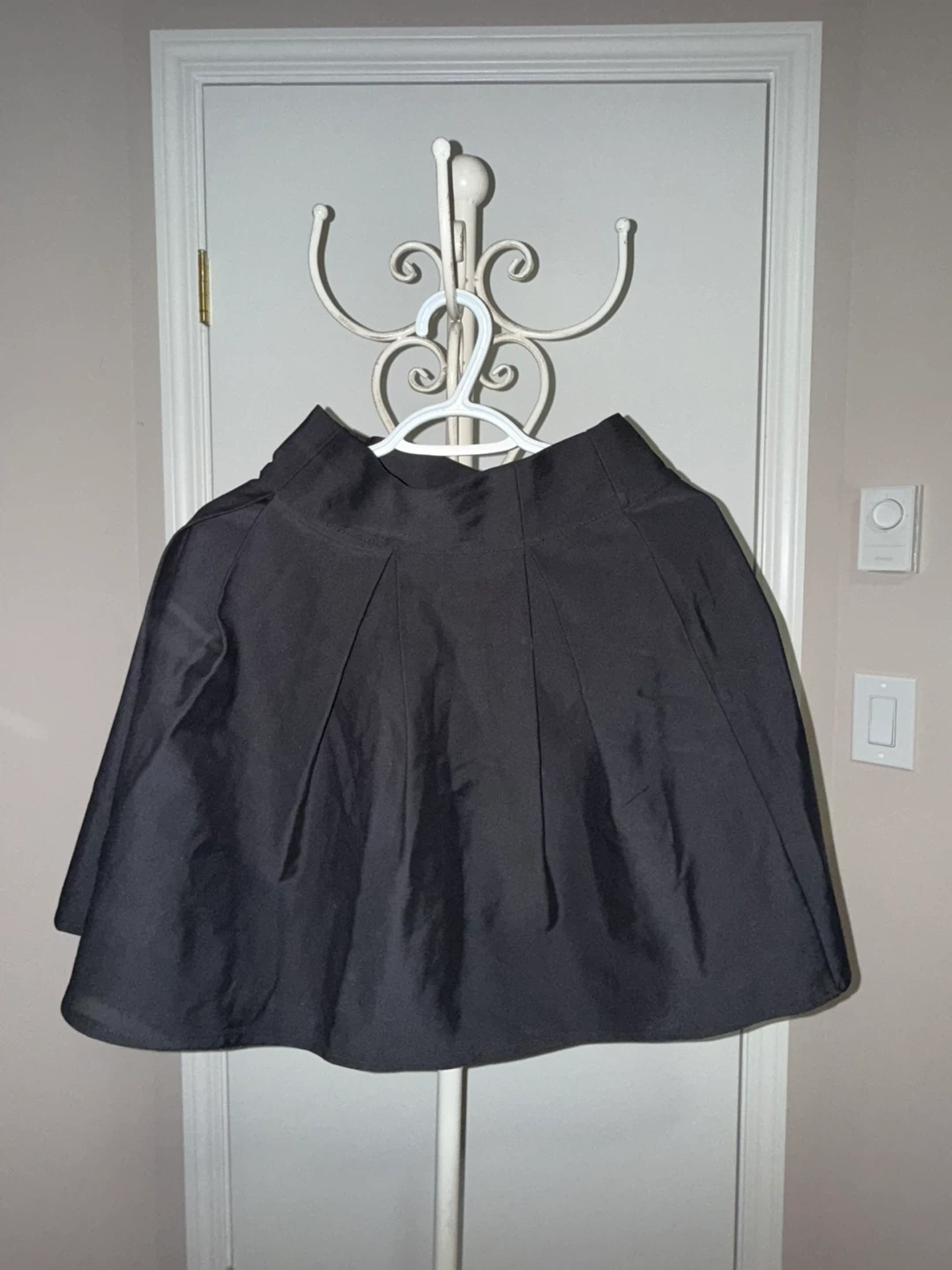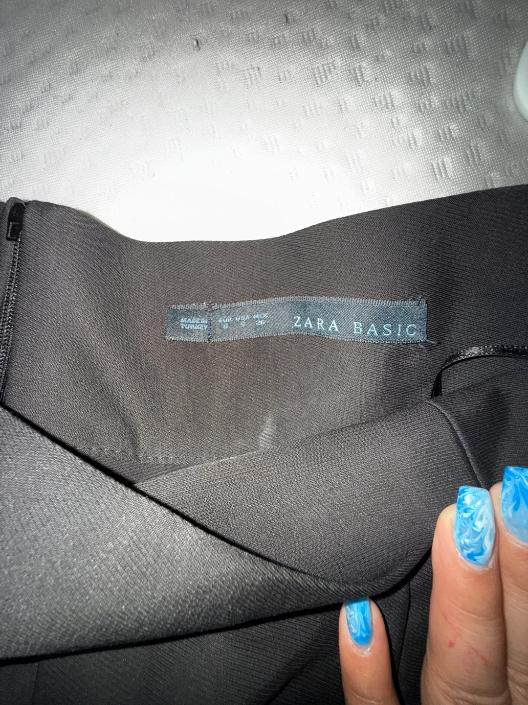 This is a black pleated skirt from Zara Basic. It's a size small and made in Turkey. The fabric appears to be a blend, giving it a nice sheen.