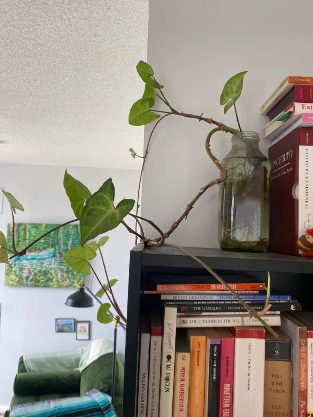 Well rooted Arrowhead cutting growing in a glass jar. It's a great piece to add some greenery to your space. The plant π± has a well-established root system. It's ready to be potted or kept in water!