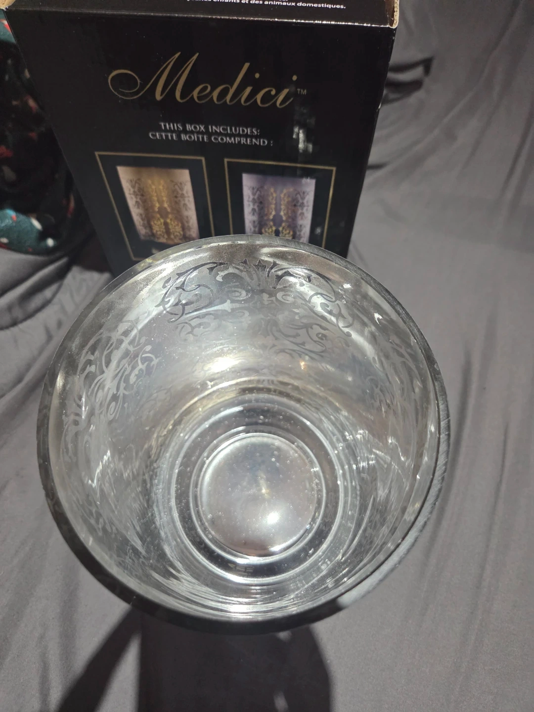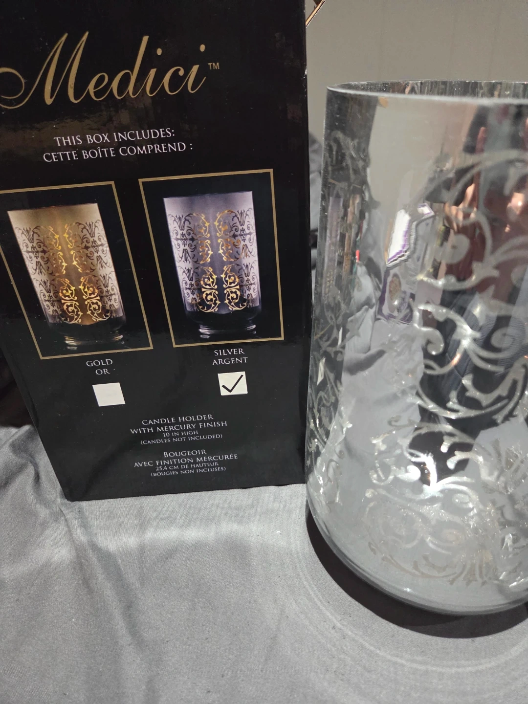 Medici candle holder with a silver mercury finish. Candles are not included. Brand new unused. Diameter 15cm and height is 24cm.