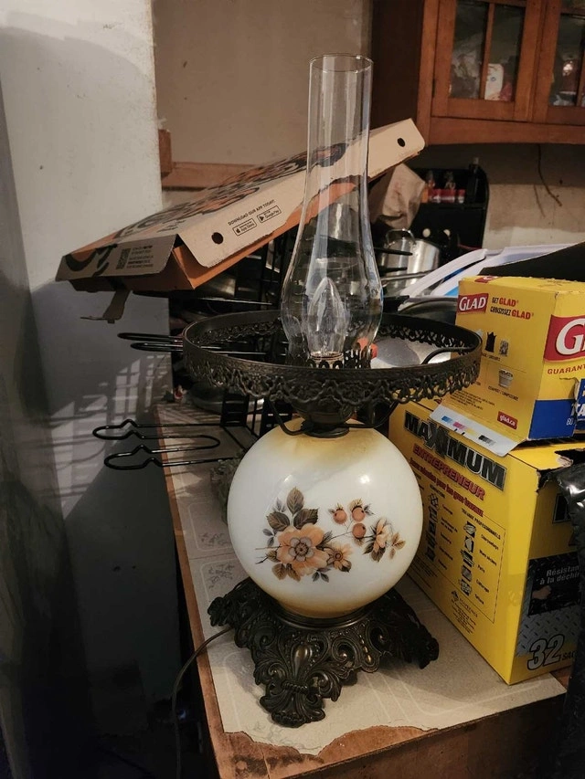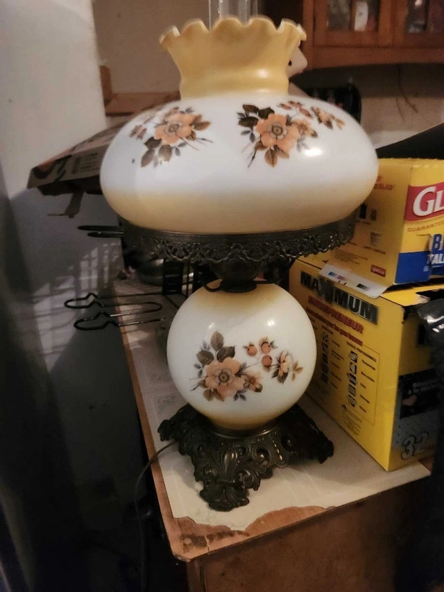 Add a touch of vintage charm to your home with this beautiful floral lamp, featuring a classic design with delicate floral patterns on both the shade and base. This lamp is used but in good condition, perfect for adding a warm and inviting glow to any room. Style: Vintage, Material: Glass, Metal, Colour: White, Bronze, Yellow, Pattern: Floral. Priced at $75. If the ad is up, the lamp is available!