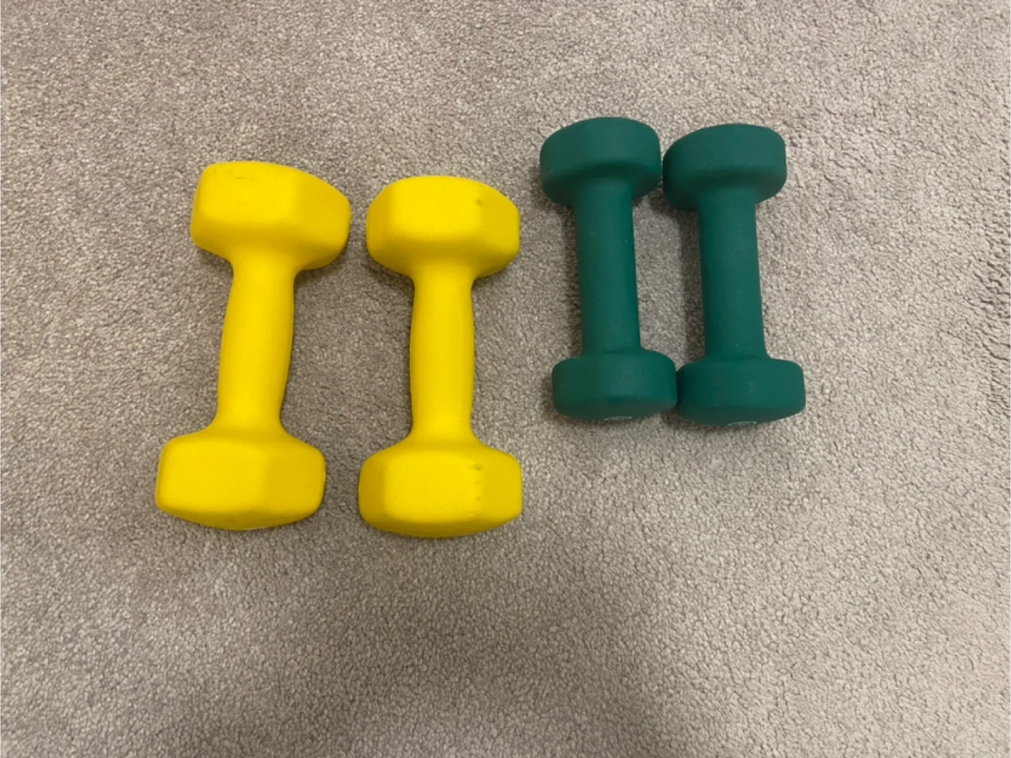 Two yellow 8lb dumbbells and two green 5lb dumbbells. They're coated for a better grip.