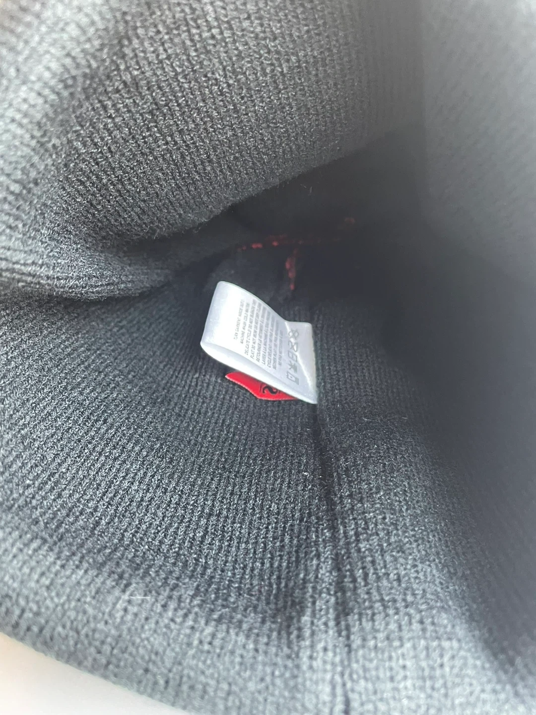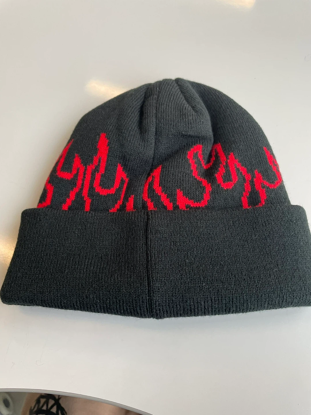 This black knit beanie features a bold red flame design wrapping around the top and a stitched devil graphic on the front. It's a warm and stylish accessory. One size fits most.