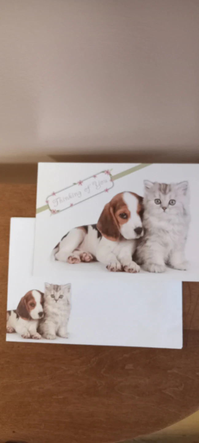 A sweet greeting card that reads 'always makes my day brighter' inside. It features adorable artwork of a puppy and a kitten on the front, perfect for sending a thoughtful message. This card is ideal for cheering someone up!