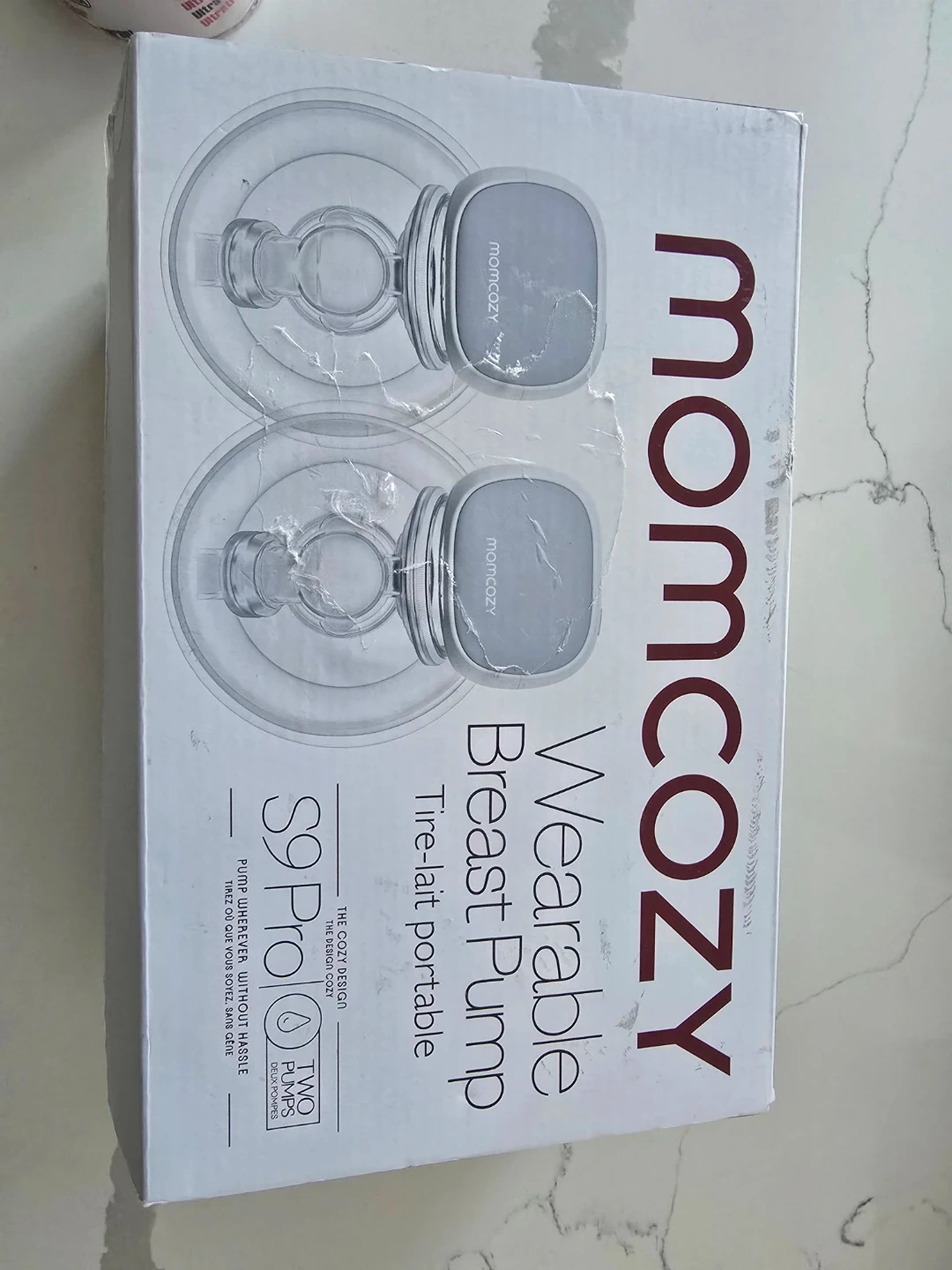 Momcozy S9 Pro wearable breast pump kit. It's tire-lait portable and comes with two pumps. Includes original box and packaging. Long lasting battery.