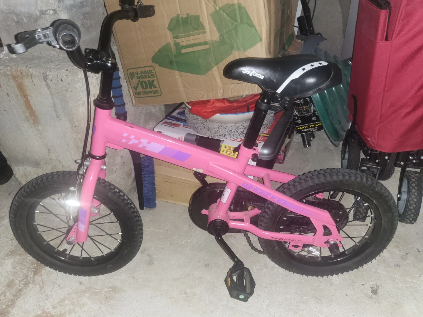 This is a pink JoyStar Whizz Kid bicycle, perfect for young riders. It's a 12-inch bike, ideal for children starting to learn to ride. The sturdy frame and easy-to-grip handlebars make it a fun and safe option.