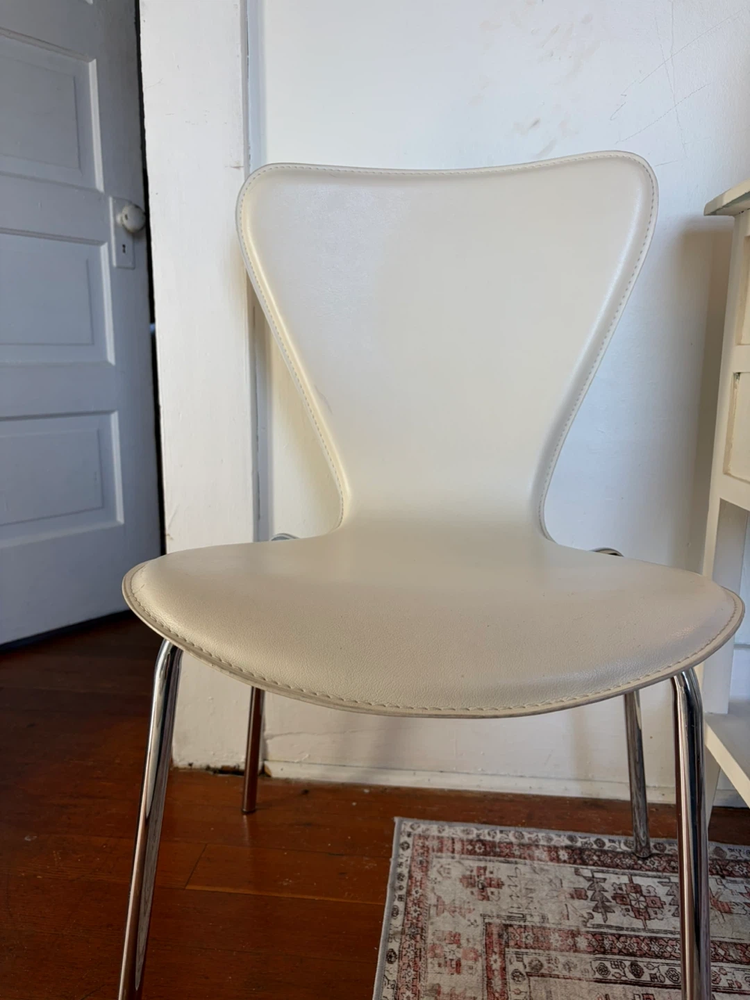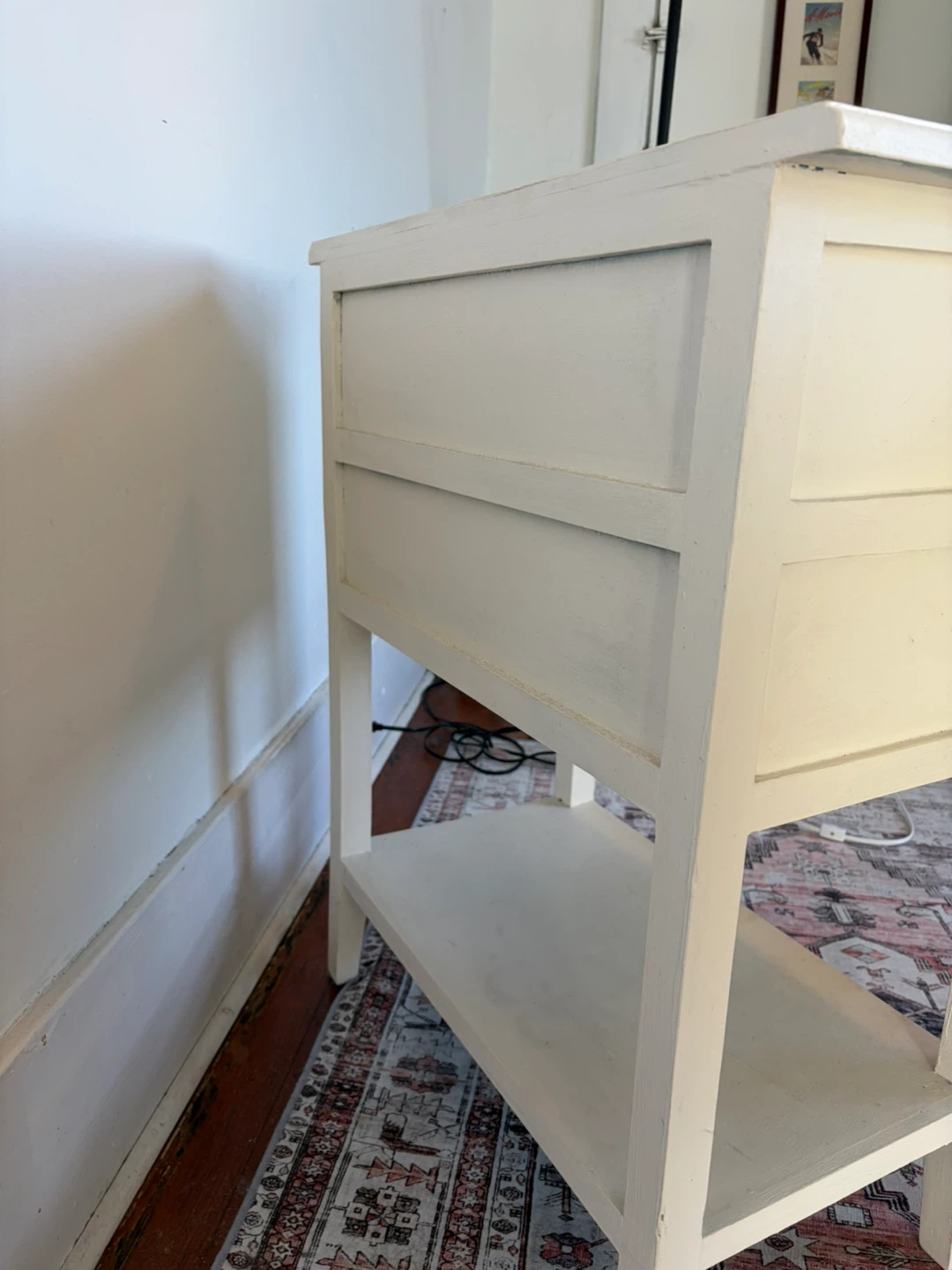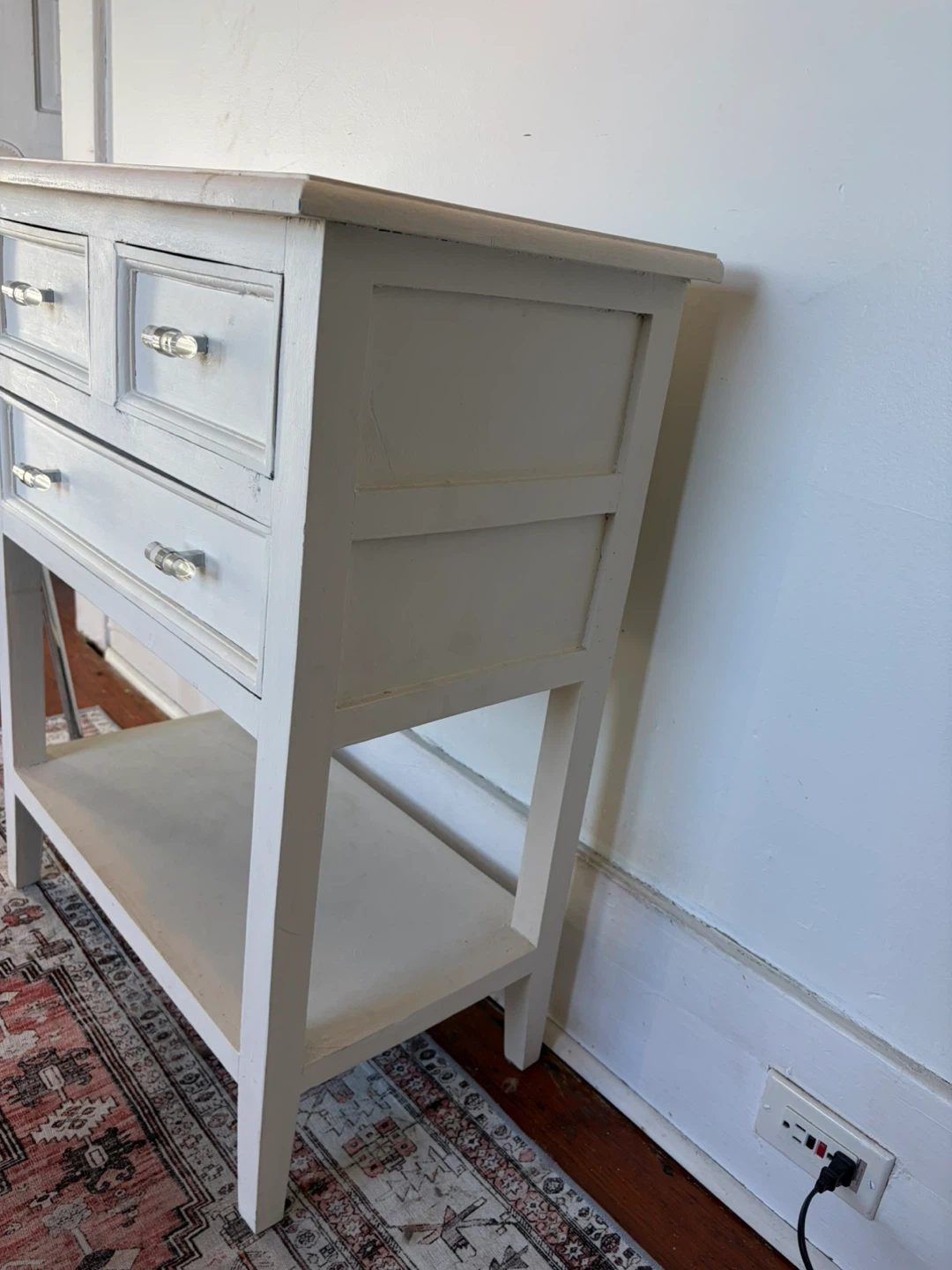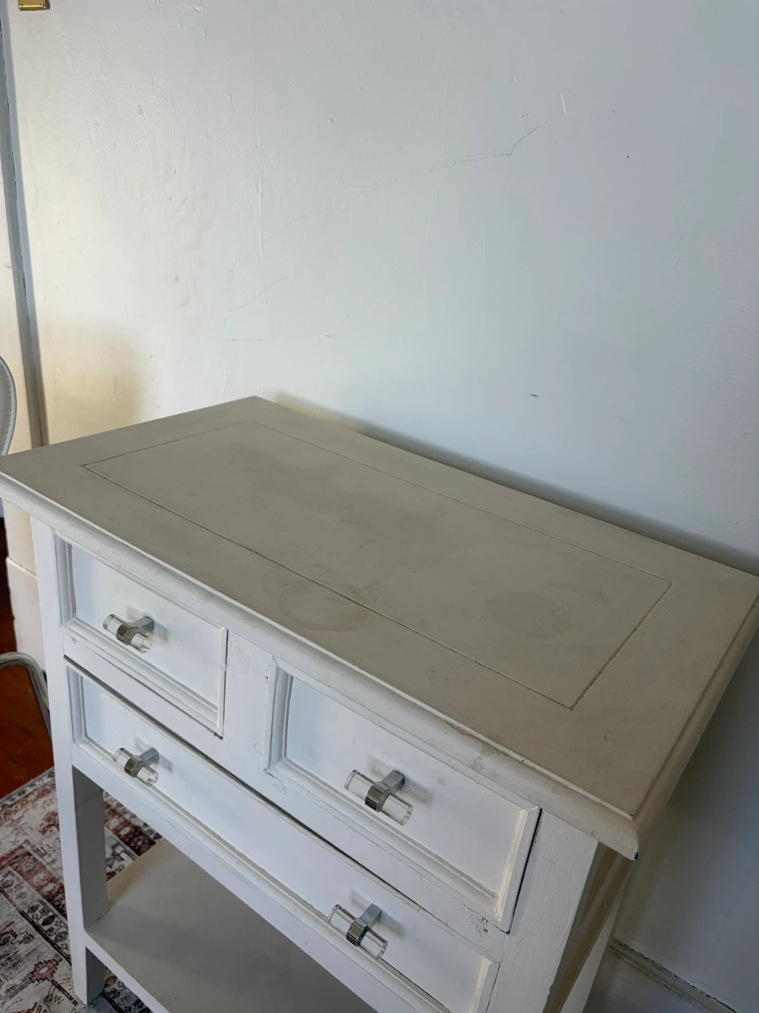 Side table, with three drawers, has some wears and tears as seen in photos, also comes with the white chair. White chair is in excellent condition.