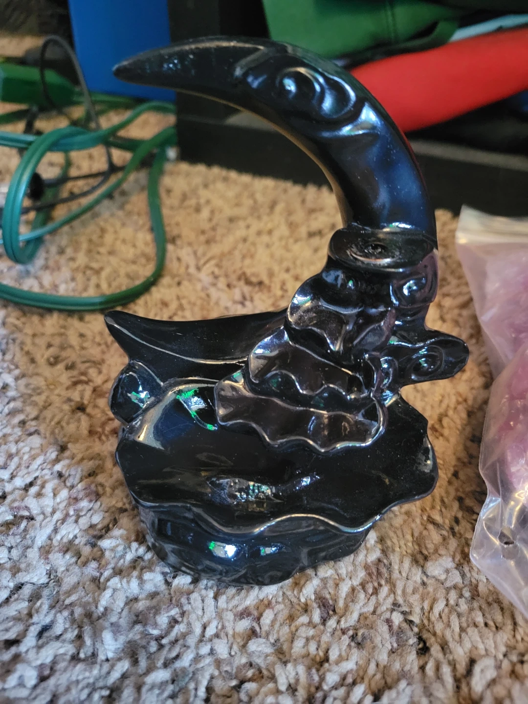 This set includes a black crescent moon shaped incense holder, a metal lotus flower incense burner, a pack of green incense sticks, and a bag of assorted incense cones. It's great for creating a relaxing atmosphere.