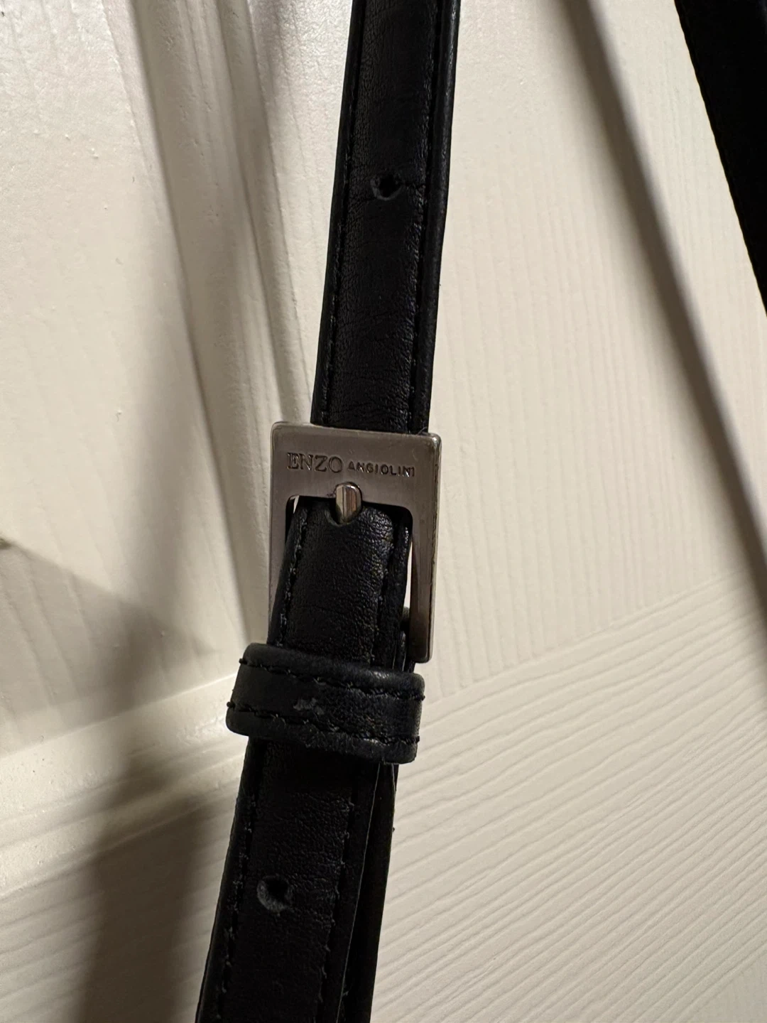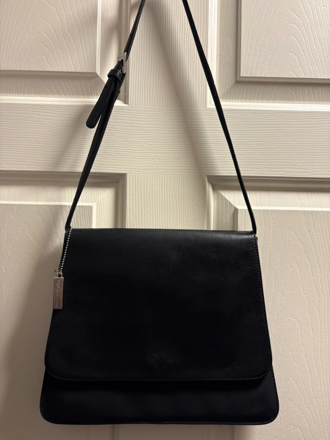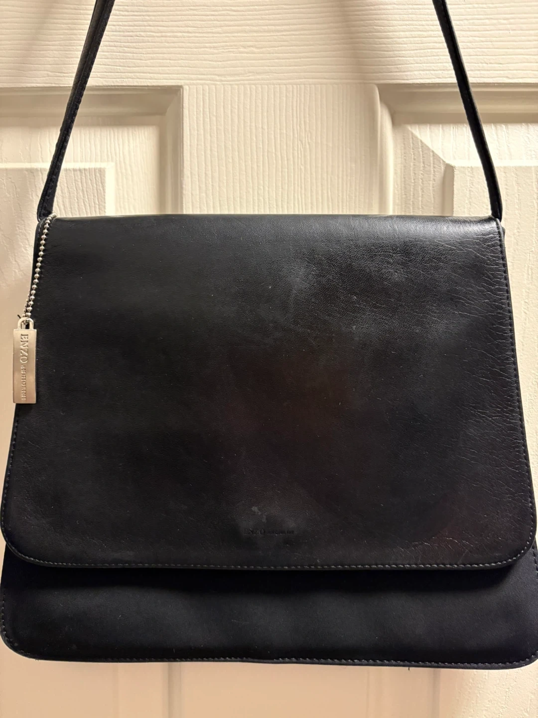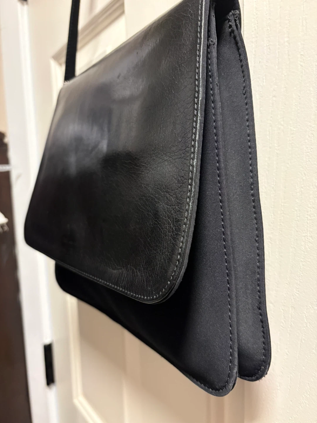 This is a black shoulder bag by Enzo Angiolini. It's a classic design with an elegant black leather flap closure and an adjustable leather strap. The rest of the bag is made of high quality nylon material. Great like new condition! Beautiful and classy shoulder bag! Pick up in Chestermere