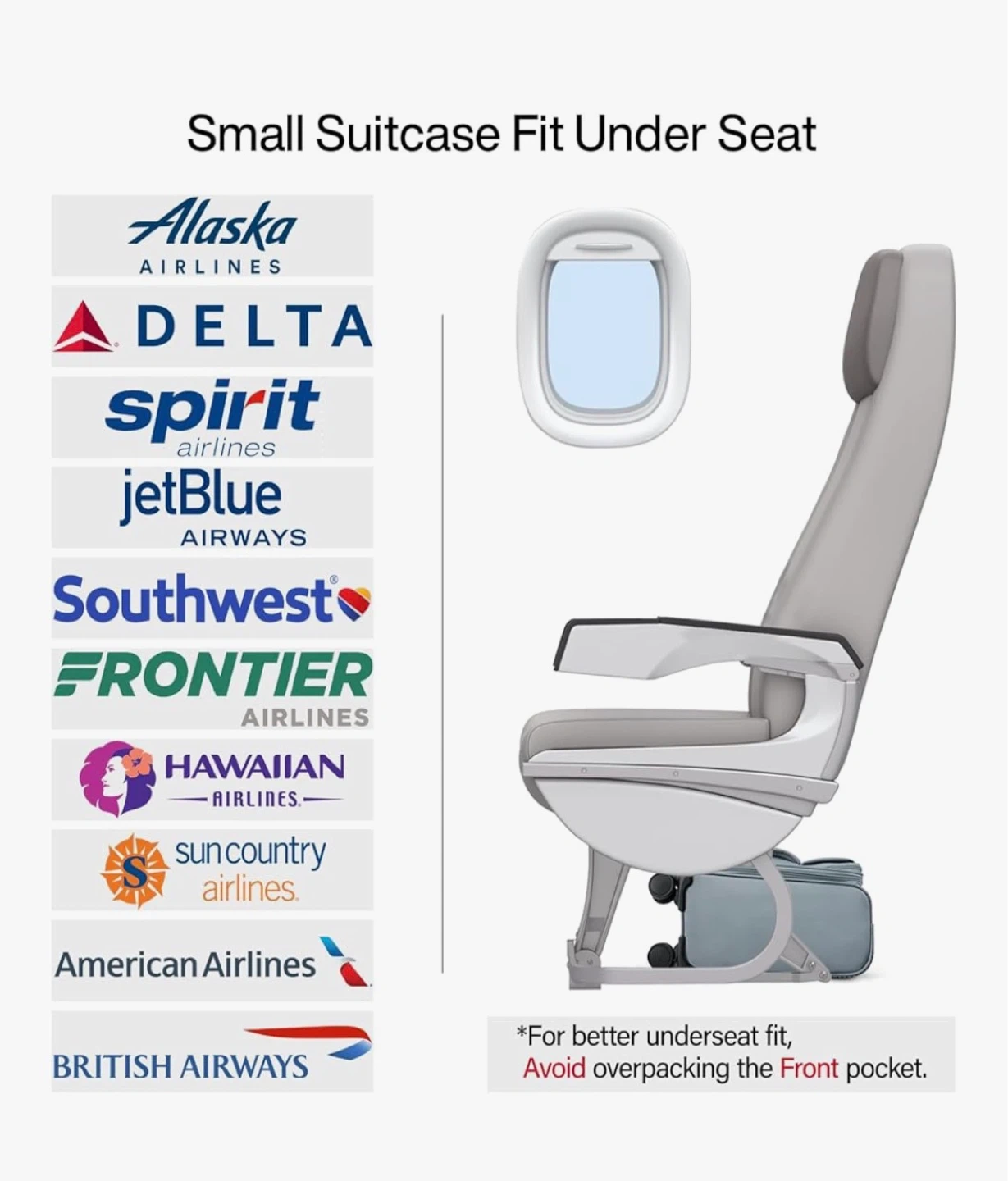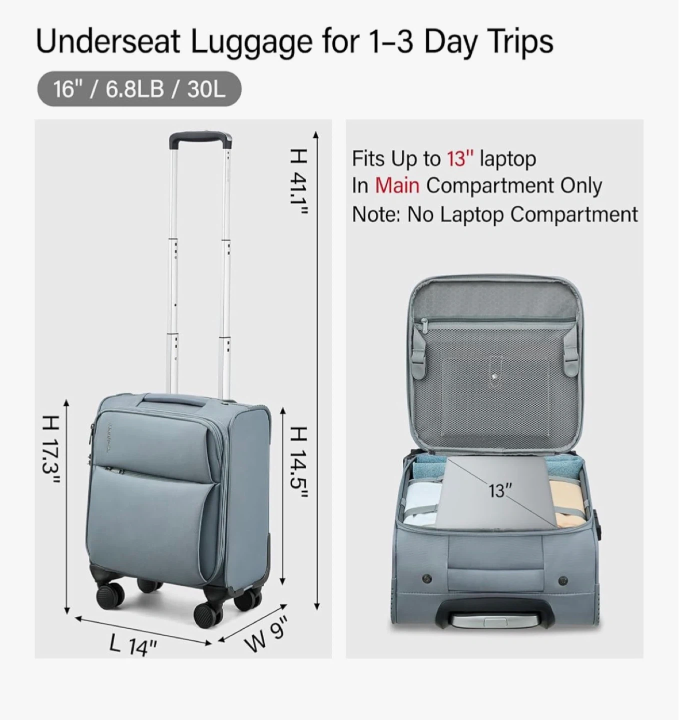 Lightweight underseat suitcase designed for 1-3 day trips. It's 16 inches tall and features a TSA combination lock. This bag fits up to a 13" laptop in its main compartment. Perfect for quick getaways!