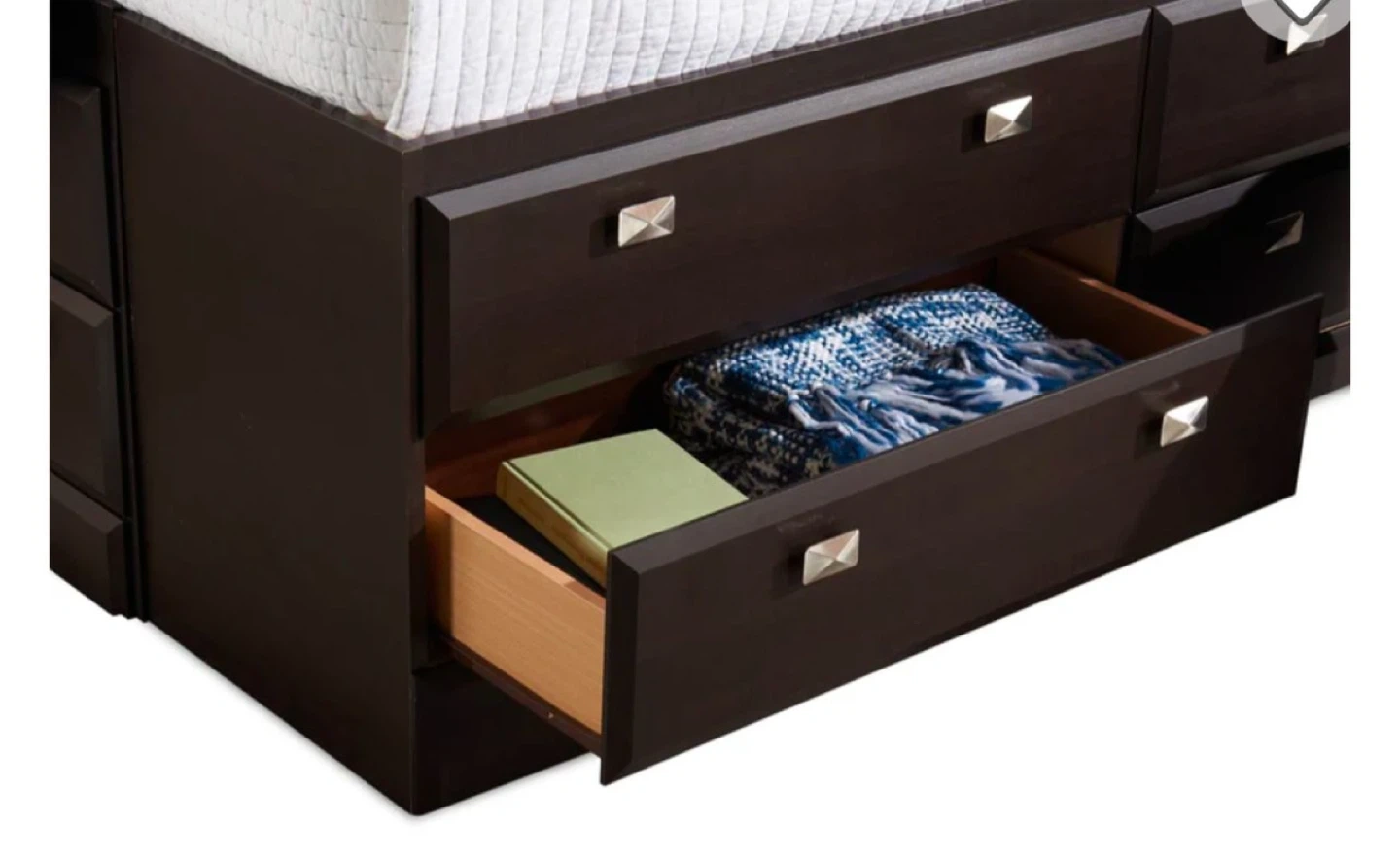Queen size bed frame in a dark brown finish. It features multiple built-in drawers for ample storage. The overall dimensions are approximately 79.5" long by 64" wide with a headboard height of 52.5". This bed frame is perfect for organizing bedrooms!