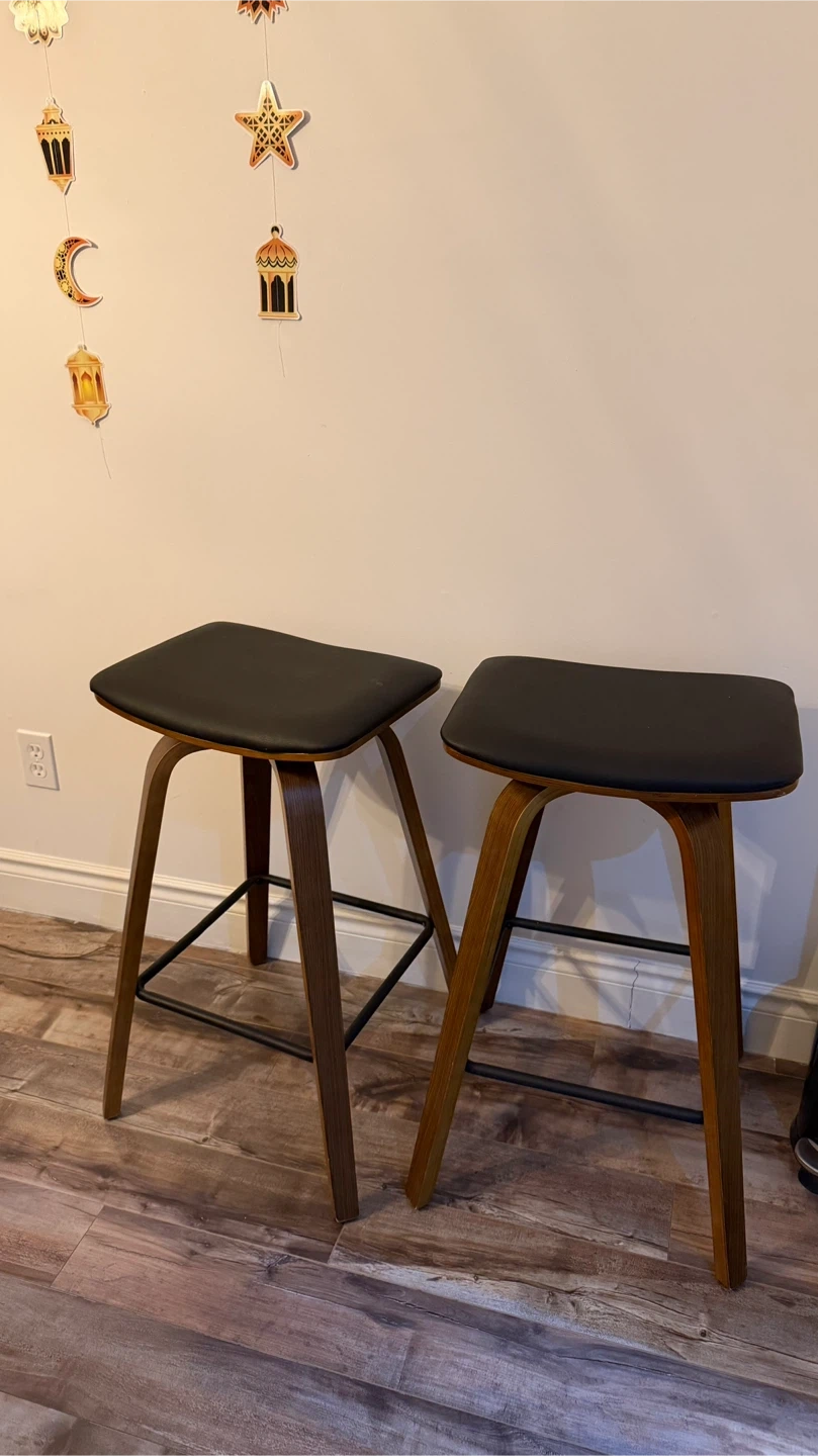 These two bar stools feature a modern design with a dark faux leather seat and a natural wood-look frame. They offer a stylish seating option for your kitchen island or home bar. The stools have a sturdy construction with metal footrests.