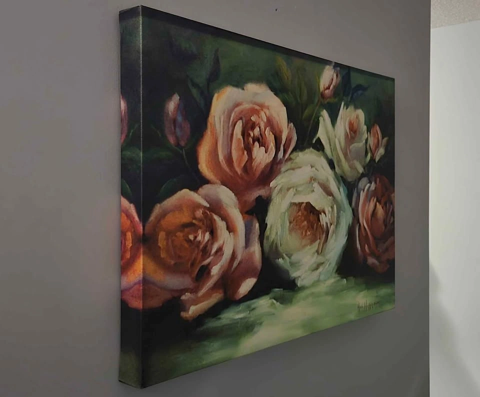 24 x 18 inches, 2 inches thick. Printed art with a painted look. Excellent condition, ready to hang. Pick up in Country Hills area.