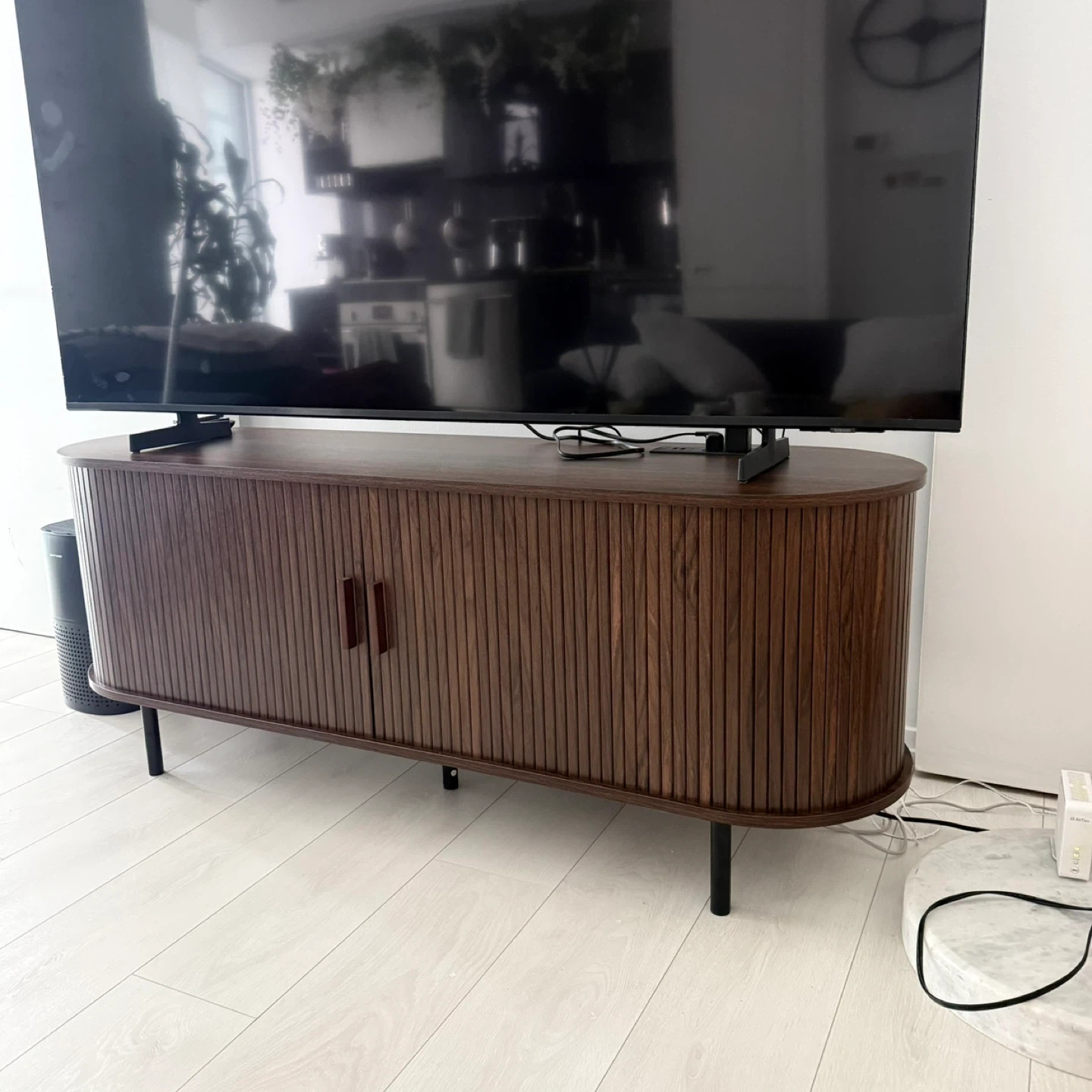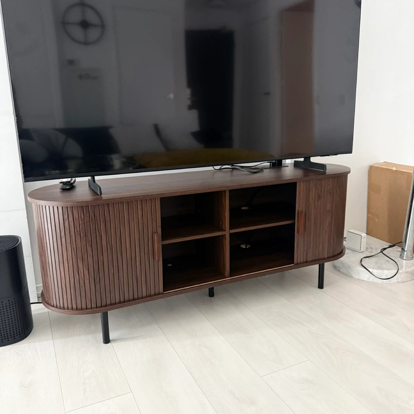 This stylish TV stand features a mid-century modern design with slatted doors and tapered legs. It offers ample storage space with adjustable shelves and cable management cutouts. It's a great way to organize your entertainment setup!