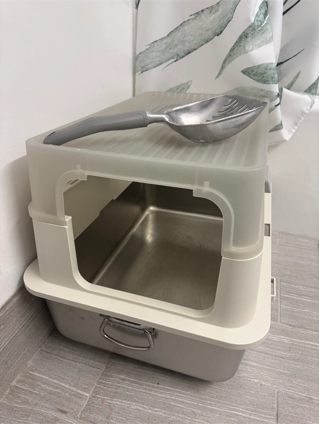 Selling a stainless steel covered cat litter box that helps contain messes and odors. It comes with a scoop for easy cleaning. The litter box is in good condition and ready for a new home!