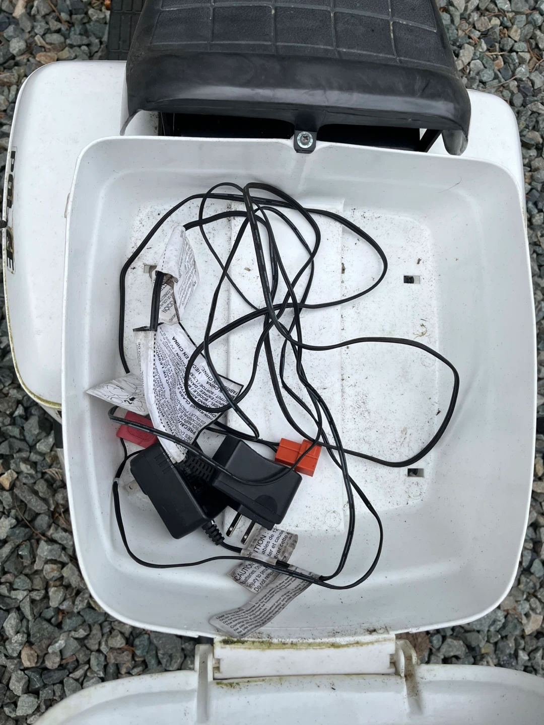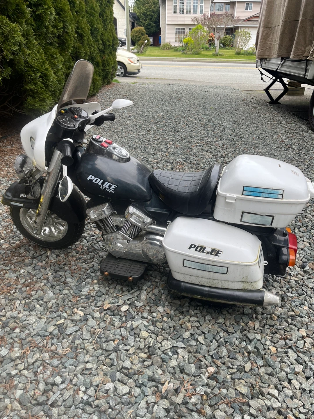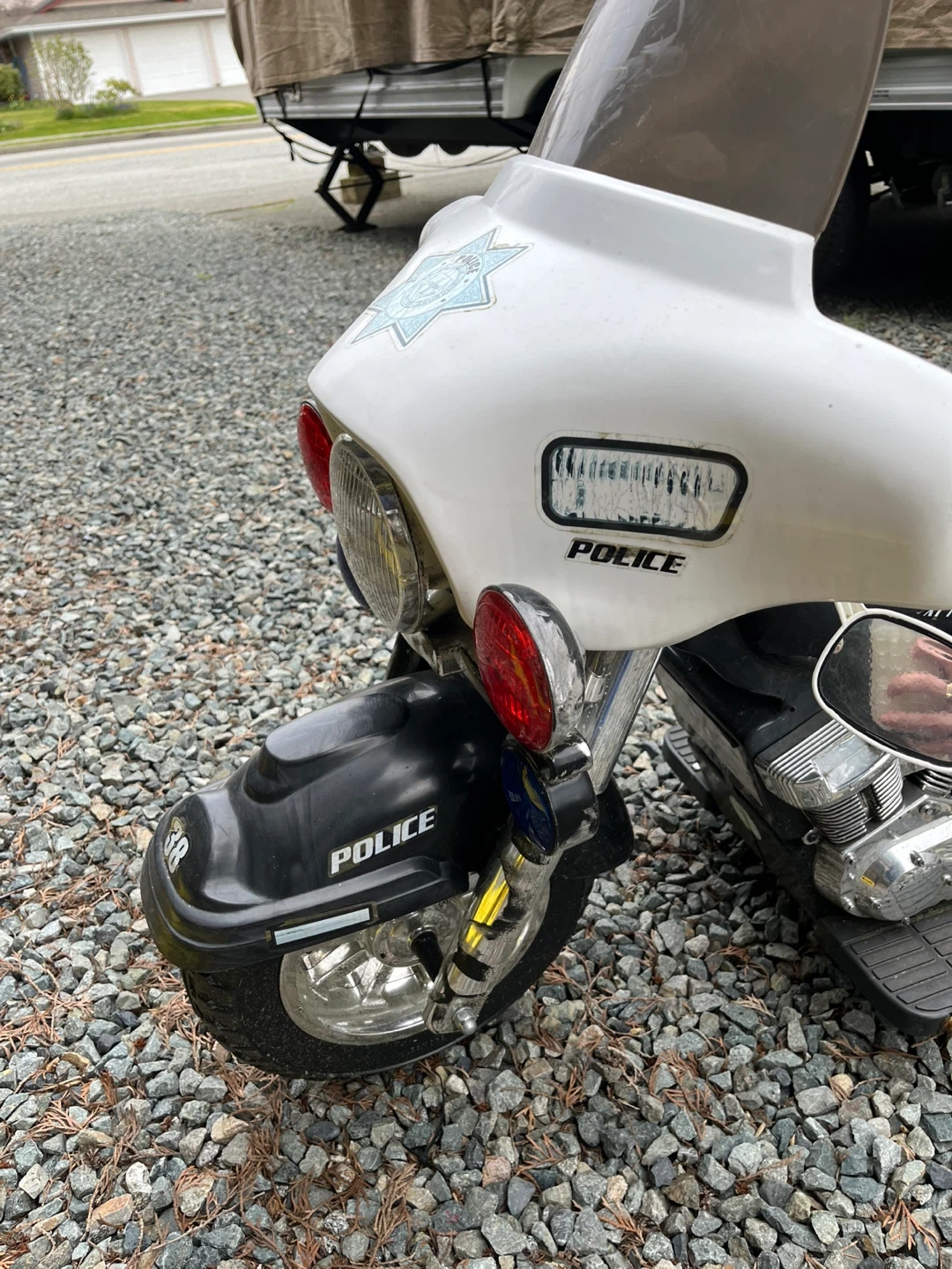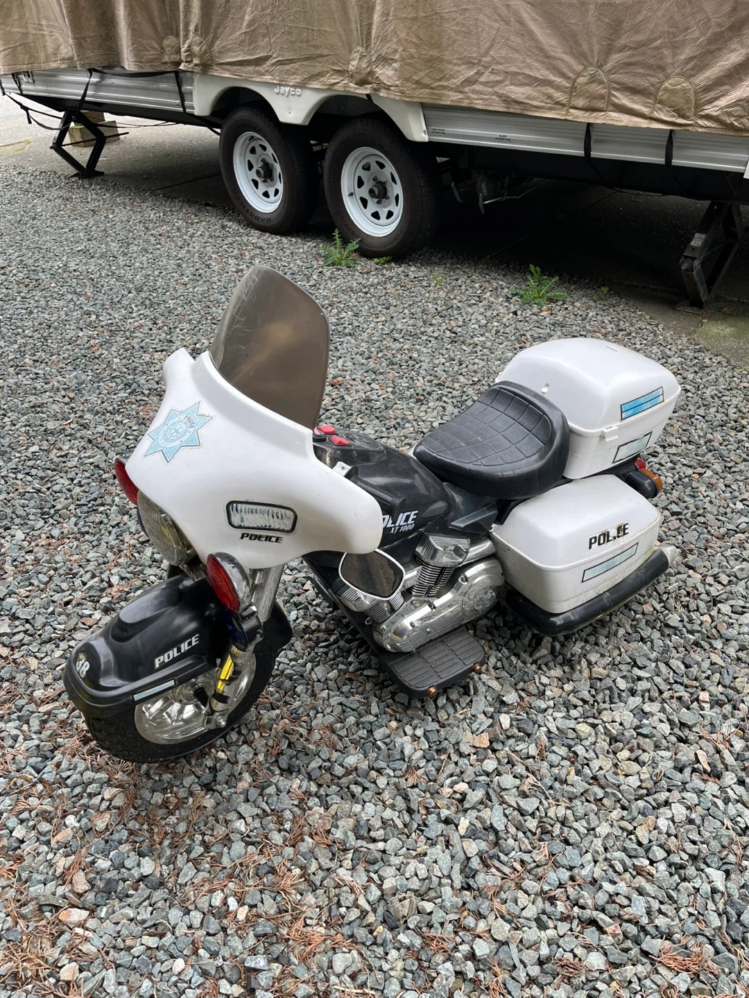 This is a kids' ride-on police motorcycle. It comes with saddlebags for storage and a windshield. Includes charger and wires.