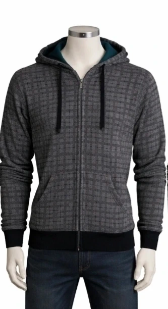 Dark gray Moto Gear branded zip-up sweater w/ hoodie with a subtle checkered/plaid pattern across the entire fabric.