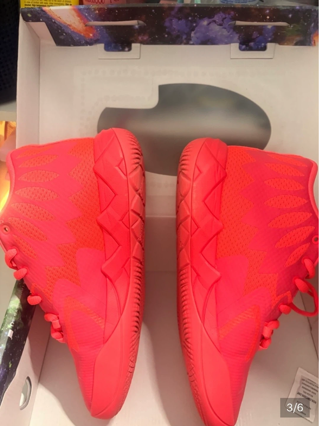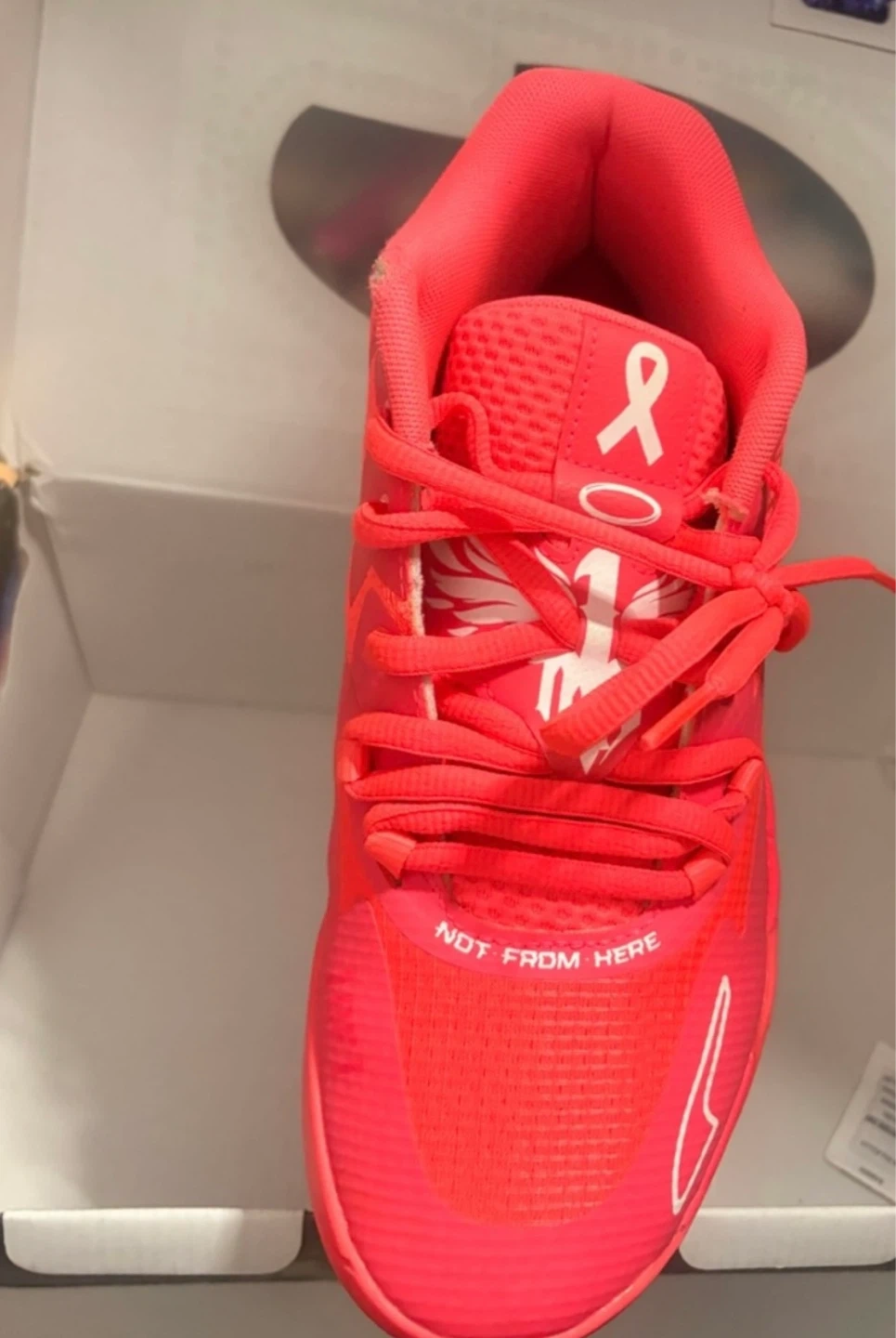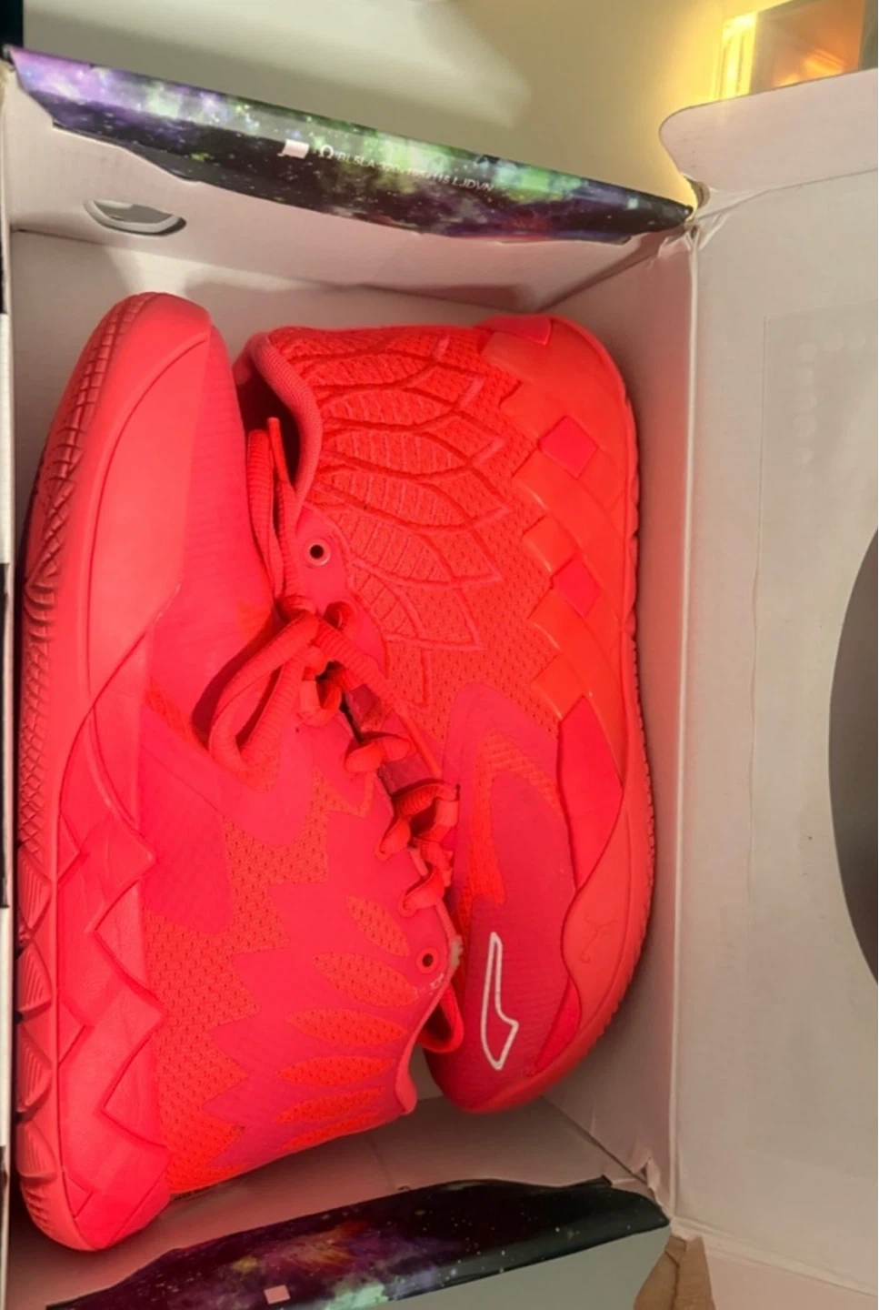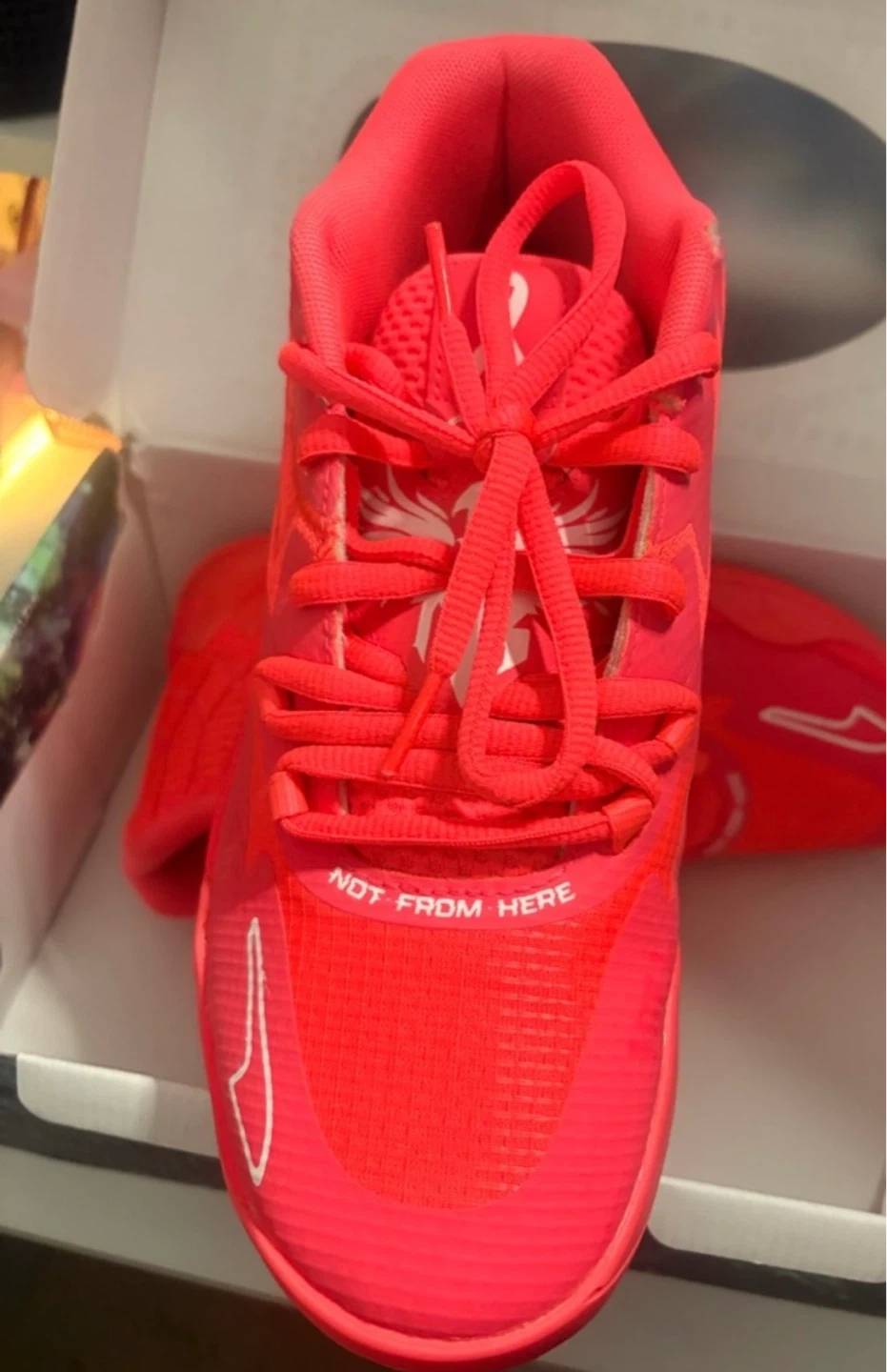 Puma MB.01 basketball shoes in bright red. Features "Not From Here" text on the toe box and comes with its original box. These shoes are designed for performance on the court.