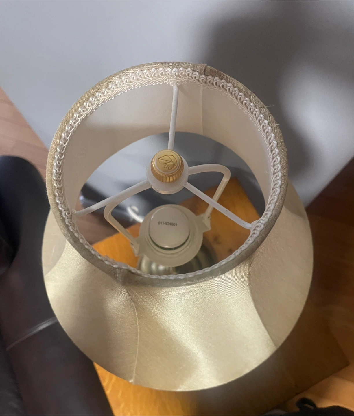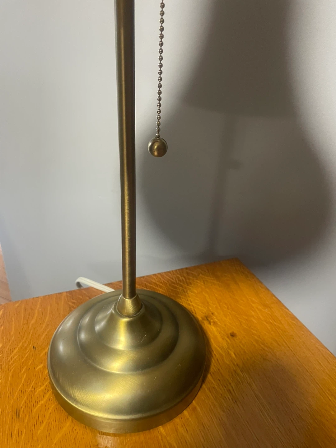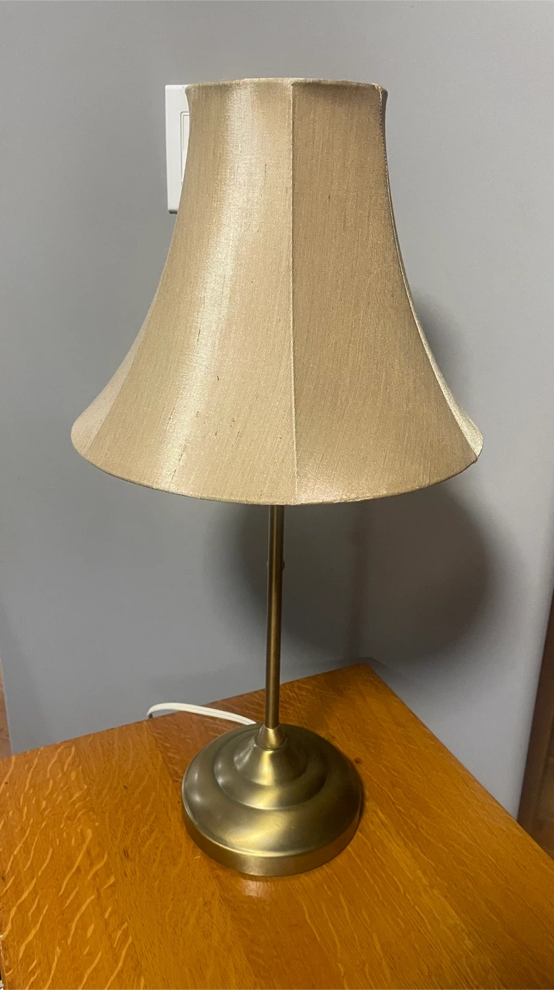 Illuminate your space with this elegant table lamp, perfect for adding a touch of warmth to any room. Featuring a classic design with a golden base and a complementary shade, this lamp stands approximately 21 1/2 inches tall, offering both style and functionality. This is a used item and in excellent condition