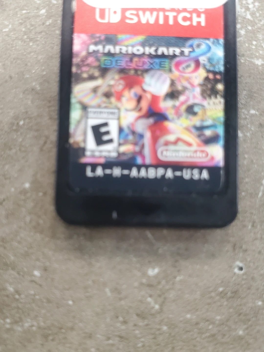 This is the Mario Kart 8 Deluxe game for the Nintendo Switch. It's rated E for Everyone. Game cartridge only, no box included.