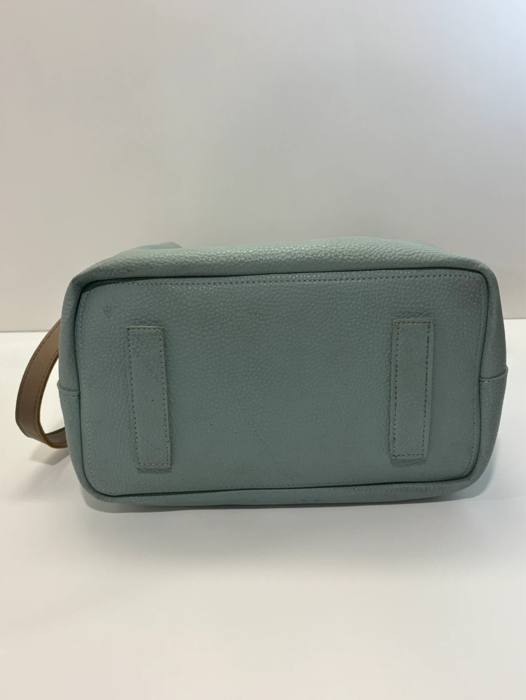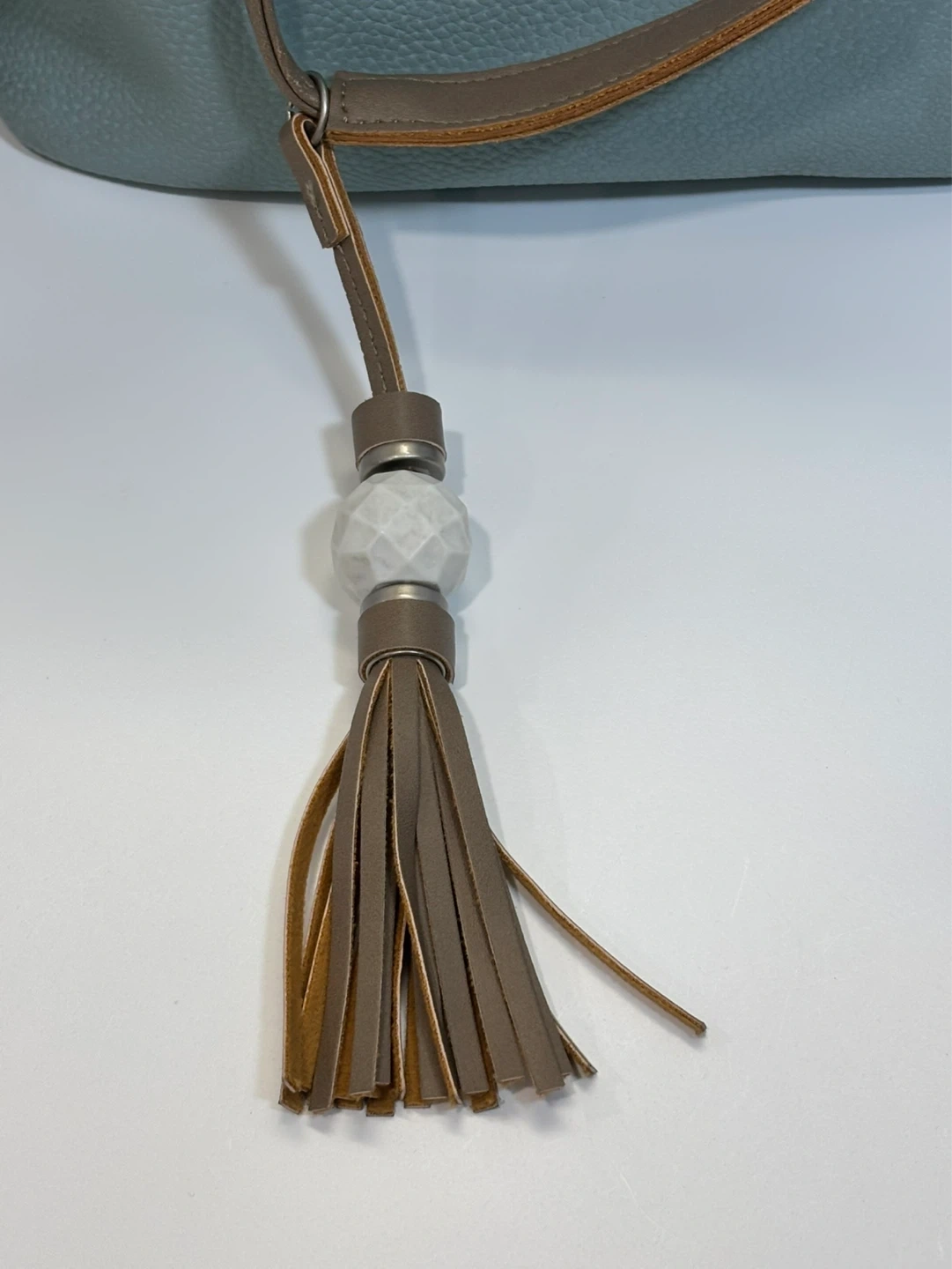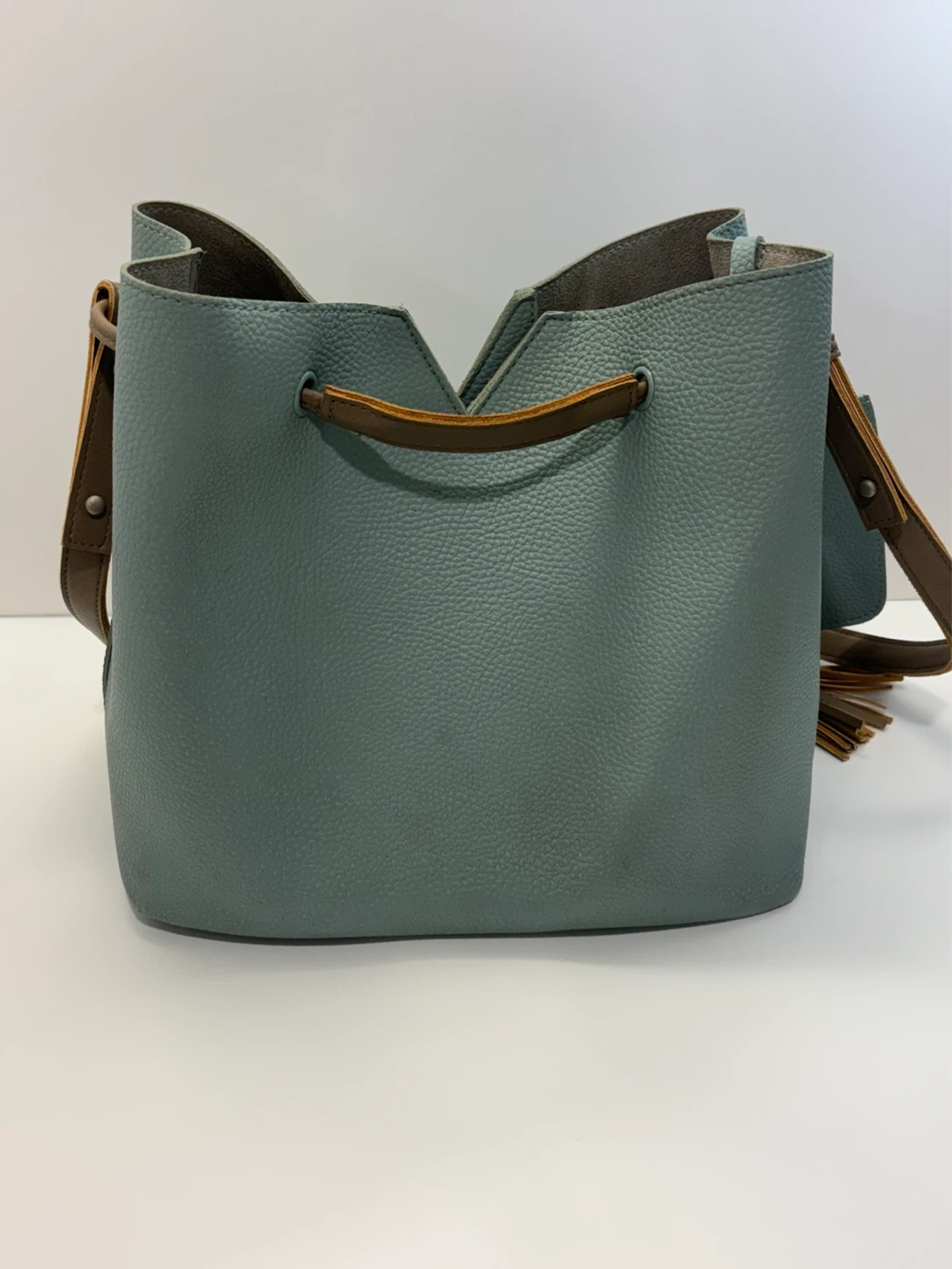 Light teal green textured faux leather women’s purse or bucket bag. Comes with a matching zippered pouch and a decorative tassel. Adjustable crossbody strap included. This bag's unique shape makes it a stylish choice for everyday use!