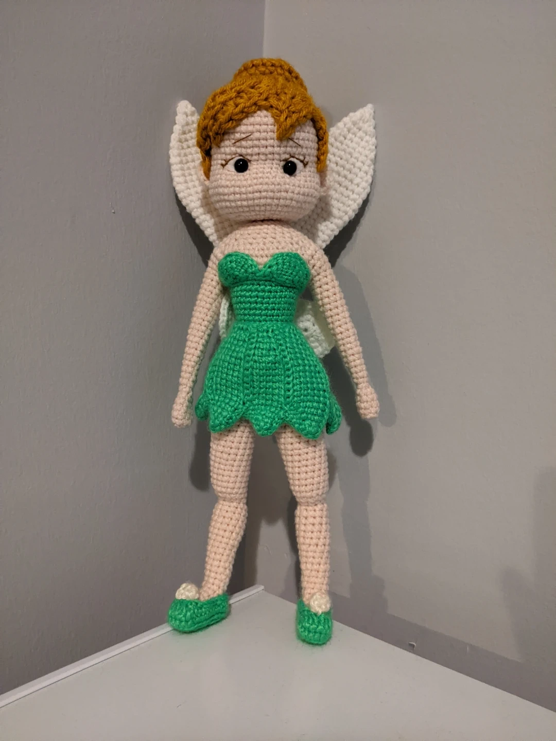 Handmade crocheted doll of Tinkerbell. This charming 14 inch amigurumi features a unique one of a kind design, green dress, white wings, and auburn hair. It's a lovely decorative piece or toy for fans of the character.