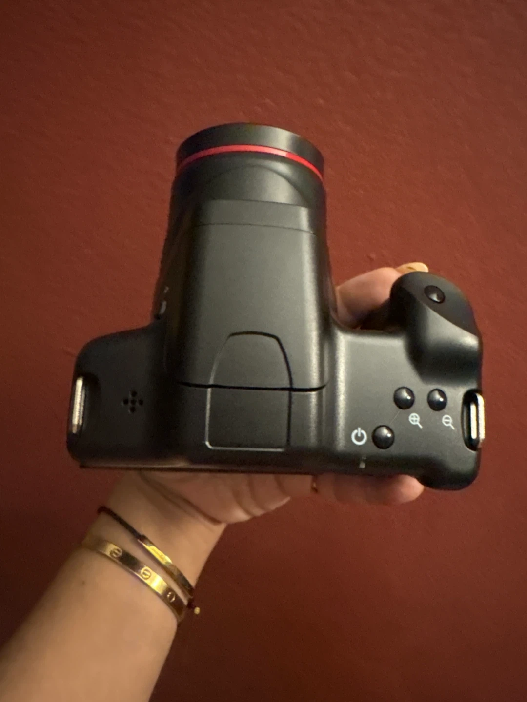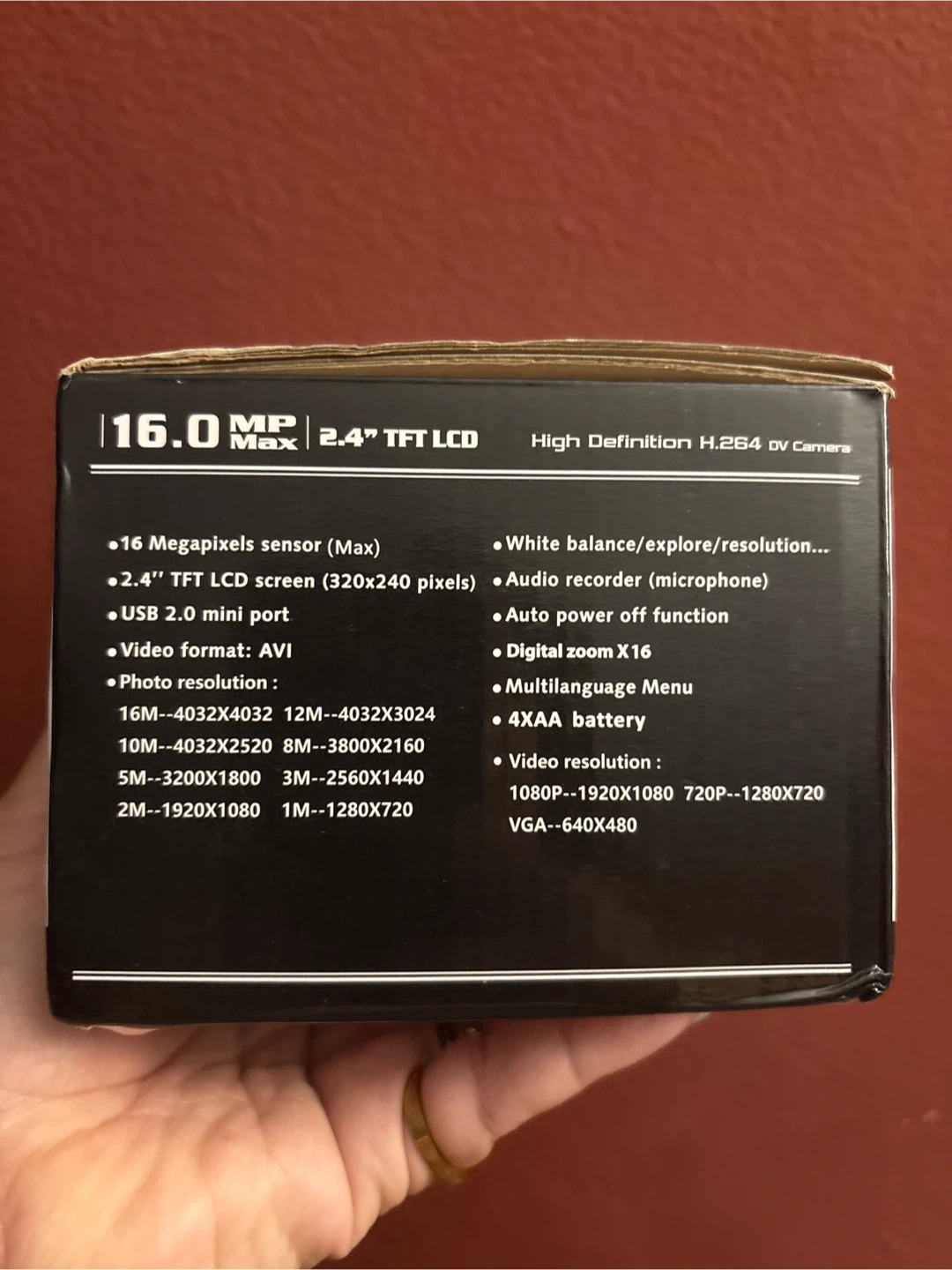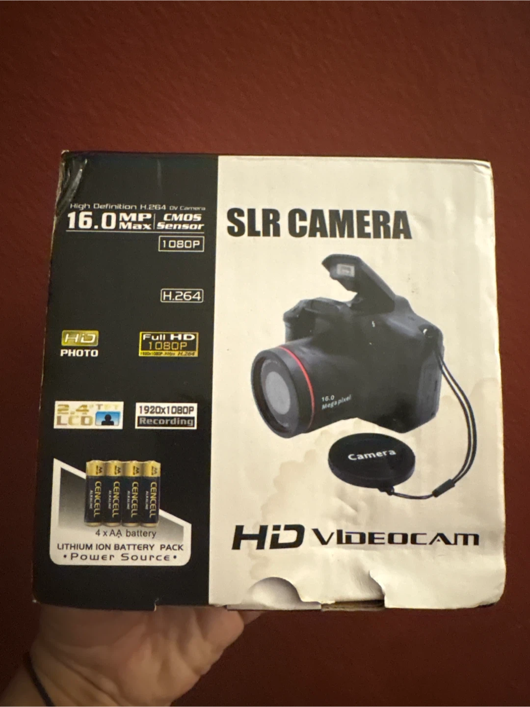 This is a 16.0 MP HD SLR camera with 1080p recording capability. It's powered by 4x AA batteries and includes a lithium-ion battery pack. The camera has a 2.4-inch LCD screen. New