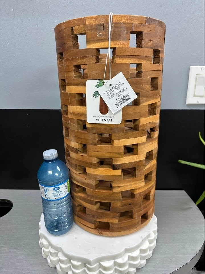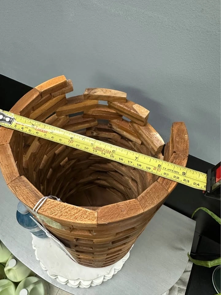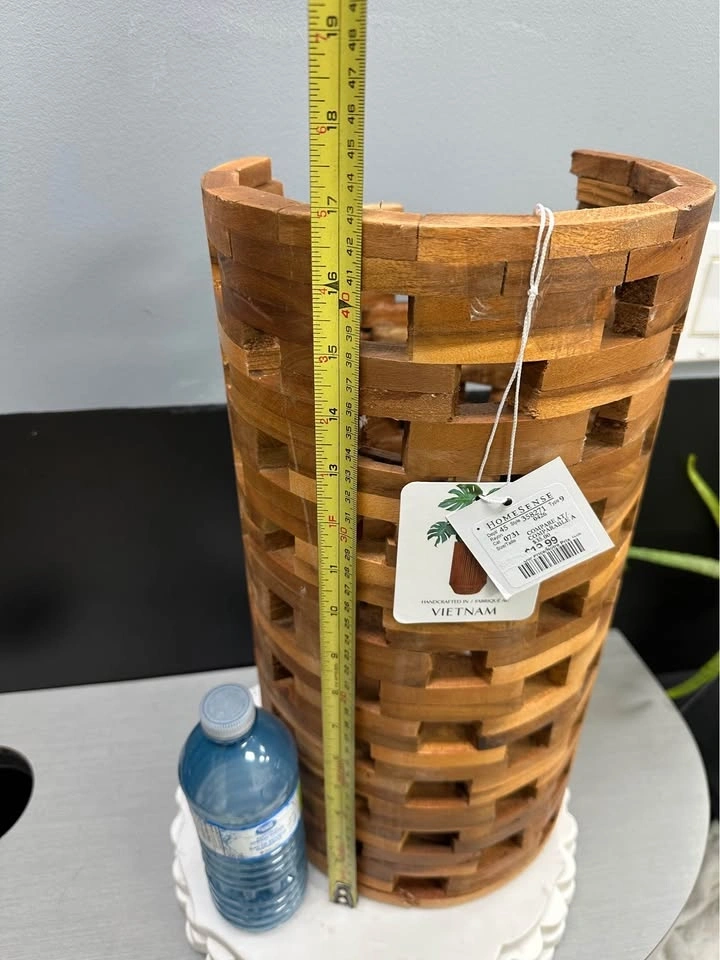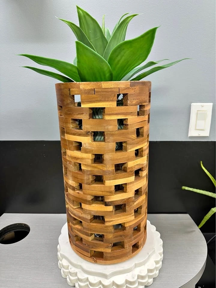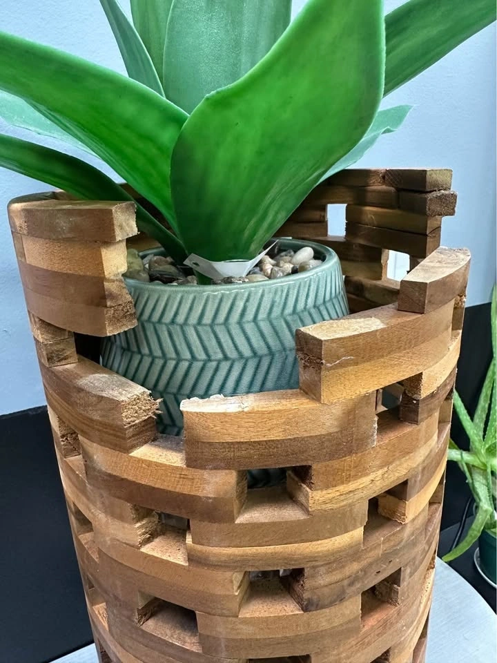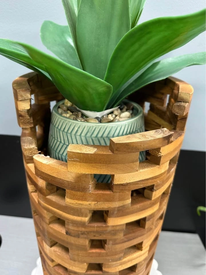 Stylish wooden planter. Has a cool open weave design. Includes the faux plant. Homesense brand, handcrafted in Vietnam. Does have a piece broken off. See pictures. $10