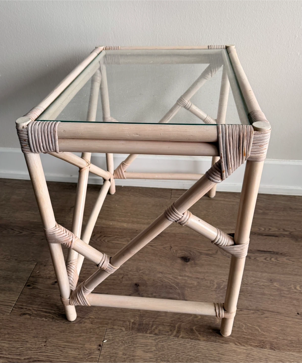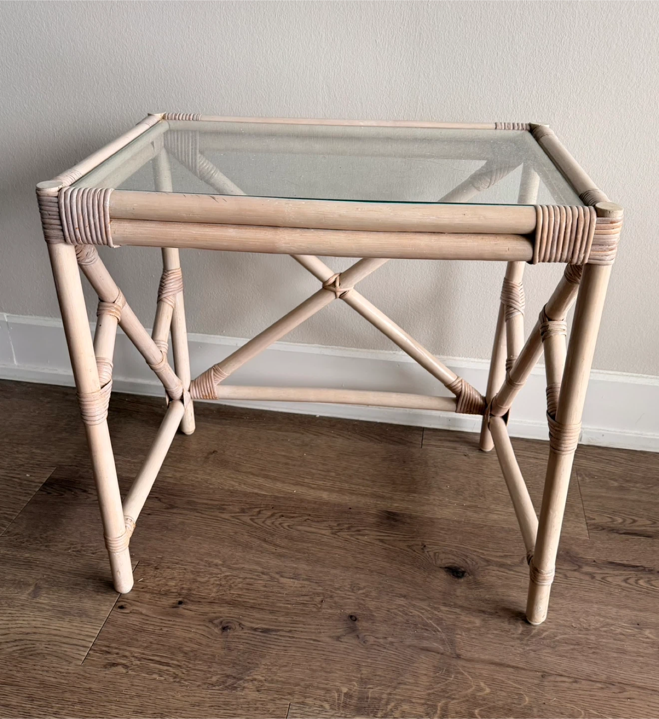 Selling a cute rattan side table with a glass top! It's in great shape and would look lovely in any living room or bedroom. The light colour of the rattan gives it a nice, airy feel.