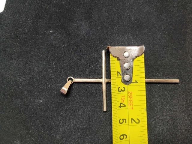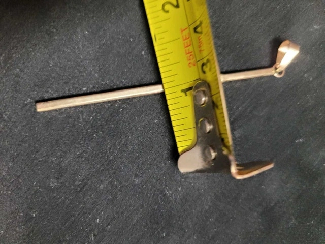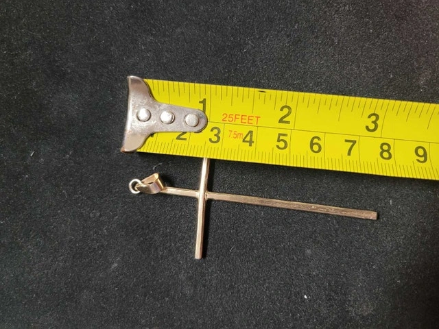 For sale is an 8.03 gram, 14 kt gold, 3" cross. My father had it custom made at Fooshin jewelry store on Richmond Road in the Glebe. He picked it up this morning, but it turned out to be too big. It was supposed to be 1.5 to 2" long but ended up being 3+" long. He brought the jewelers 7.5 grams of 14kt and 1.5 grams of 10k for a total of 9 grams. The cross weighs 8.03 grams and has no stamp. Asking $1500. Pick up at the OPP POLICE STATION PARKING LOT ON CAMPEAU STREET IN KANATA. Thank you