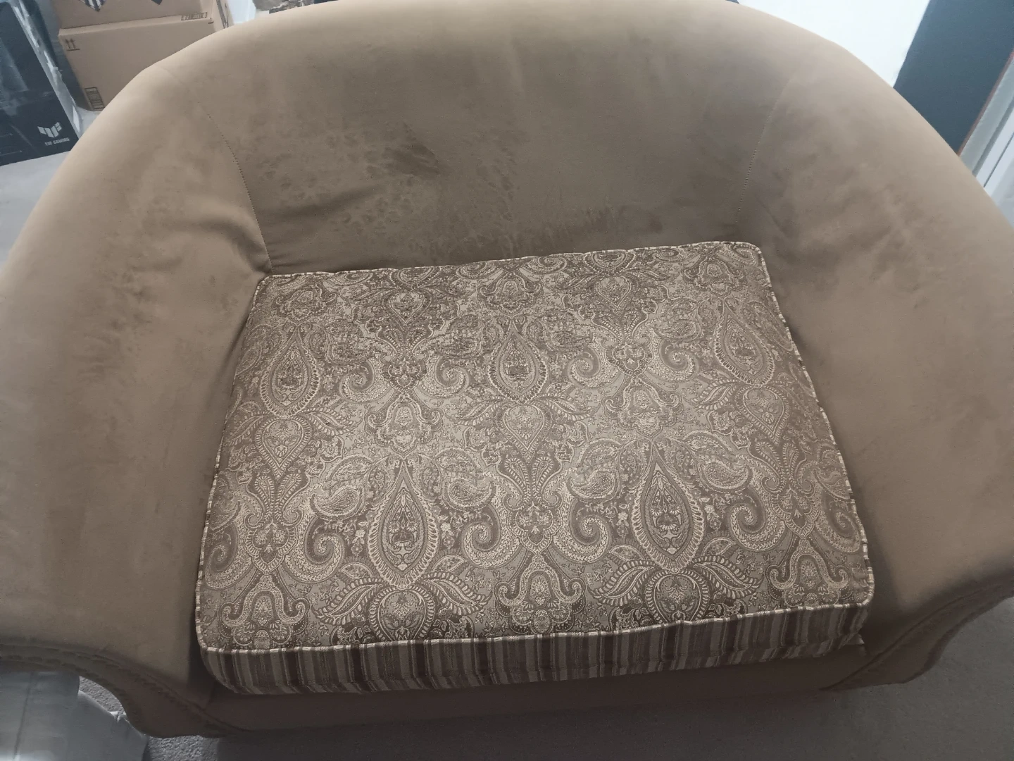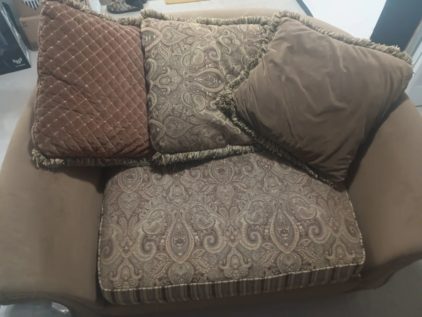 Marilyn Monroe Love Seat and matching ottoman upholstered in a soft, neutral fabric. Features decorative paisley patterned toss pillows for added style. It's a great set for a reading nook or living room.