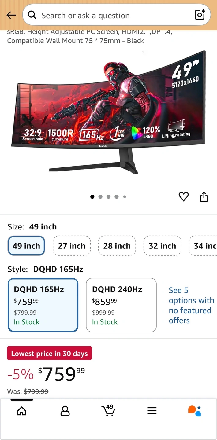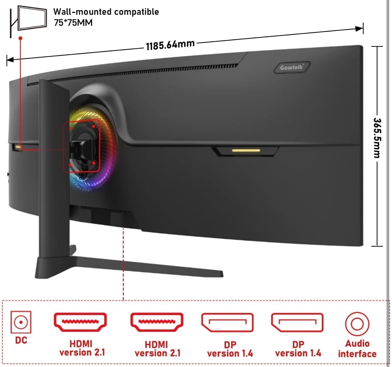 49 inch Ultra-Wide Curved 1500R Gaming Computer Monitor, DQHD(5120×1440), 1MS,165Hz, FreeSync, 120% sRGB, Height Adjustable PC Screen, HDMI2.1,DP1.4, Compatible Wall Mount 75 * 75mm - Black