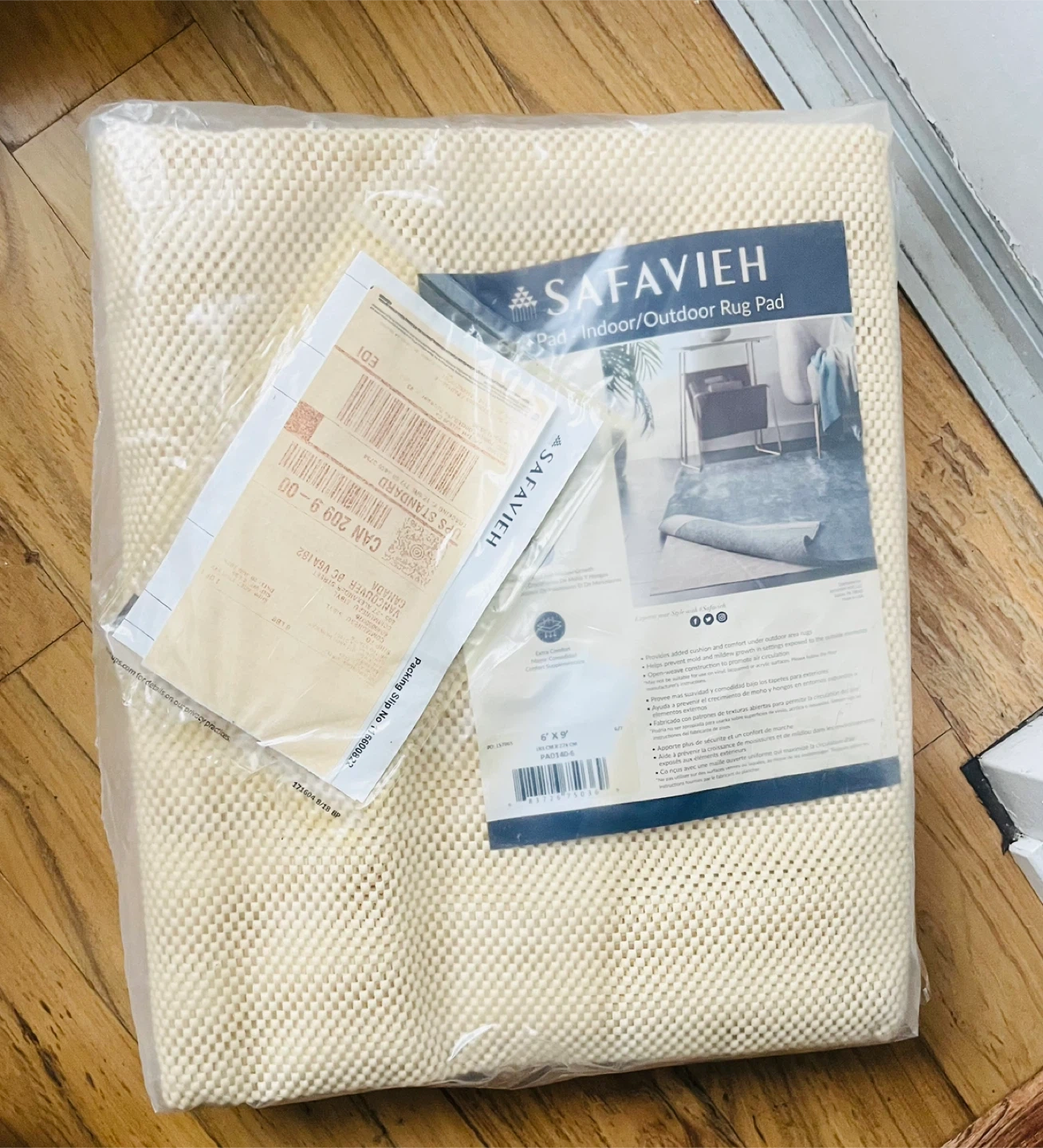 This is a Safavieh indoor/outdoor rug pad. It's designed to provide grip and protection for your rugs. The pad is 6' x 9' in size. It's made of a durable, woven material.