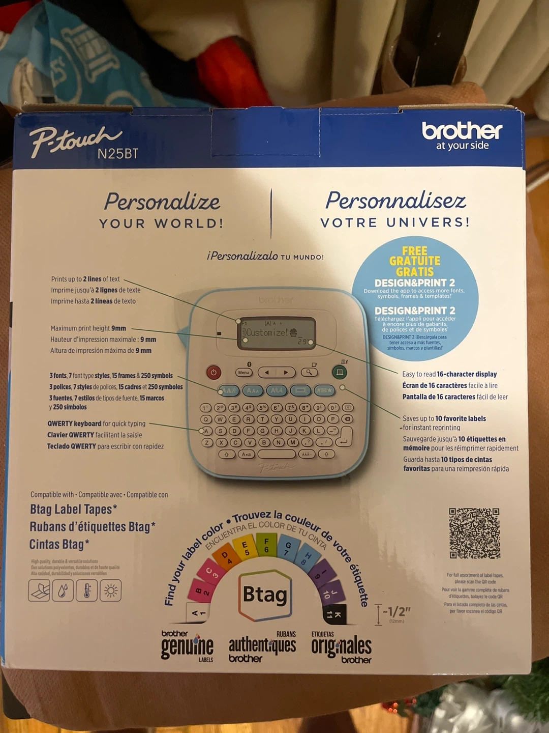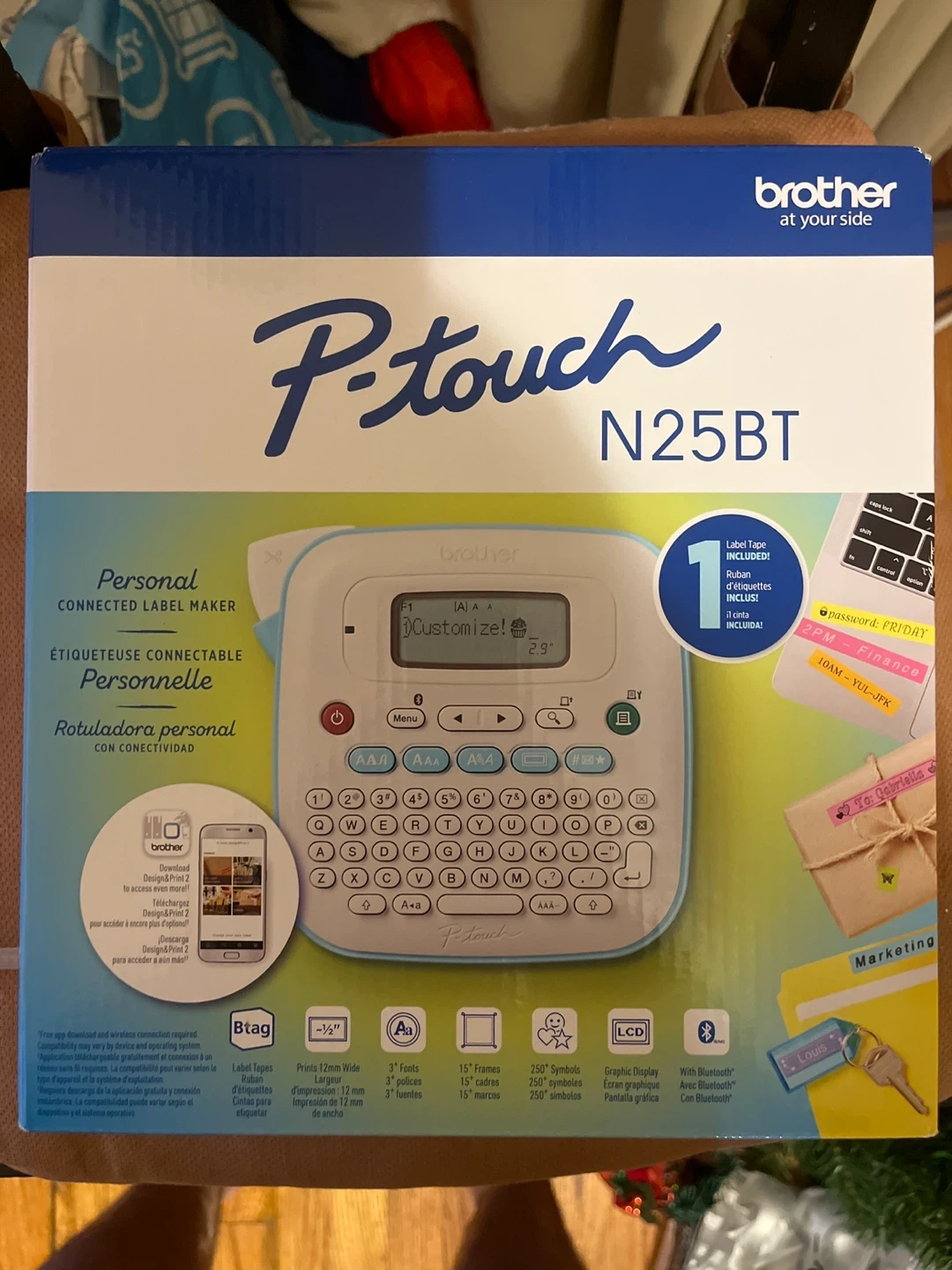 Brother P-touch N25BT personal label maker. Prints up to 2 lines of text. Features a 16-character LCD display. Connects via Bluetooth for use with the Design&Print app. Supports 12mm label tape.