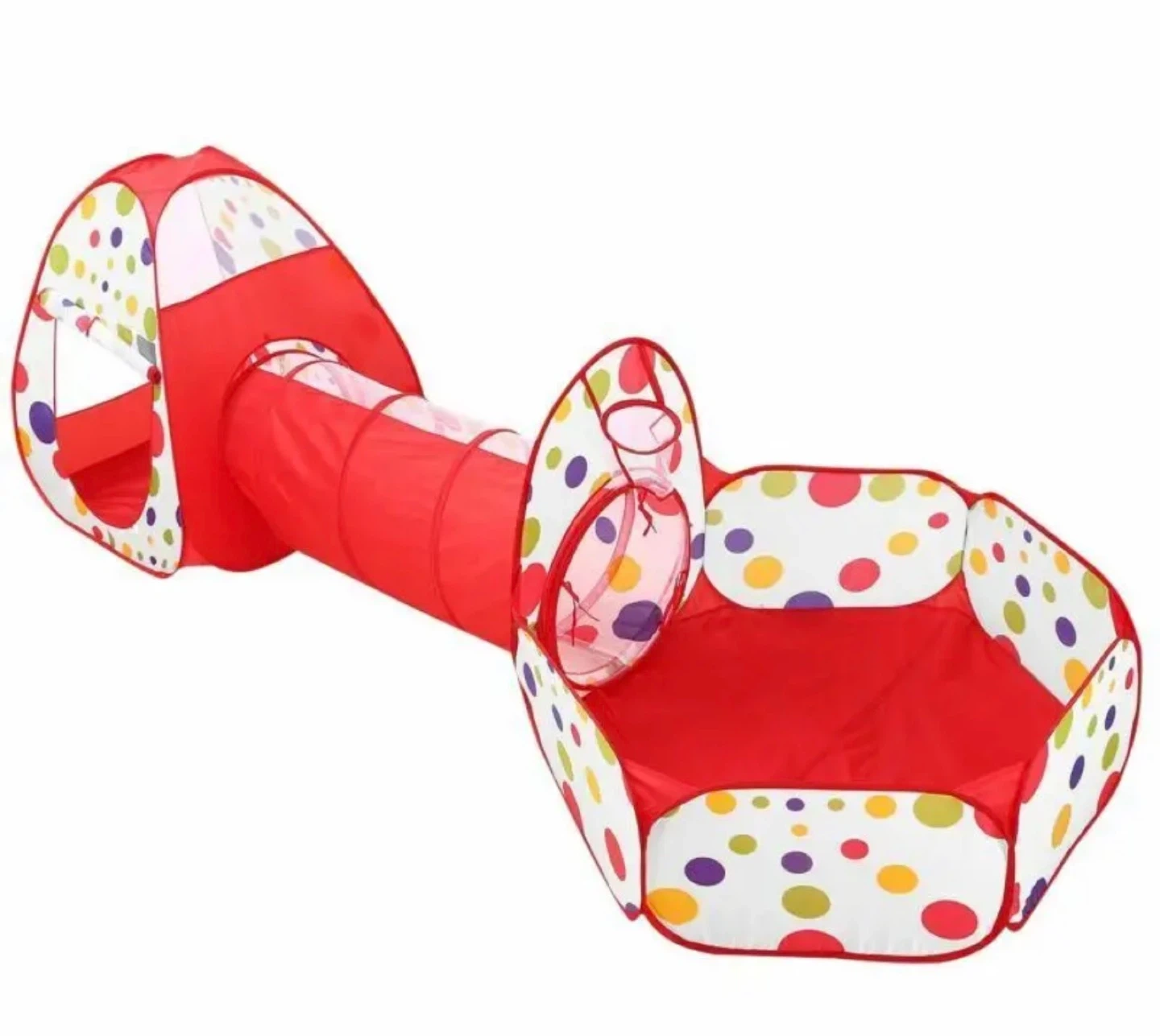 3-in-1 pop-up play tent, ball pit, and crawl tunnel set. It has several features: