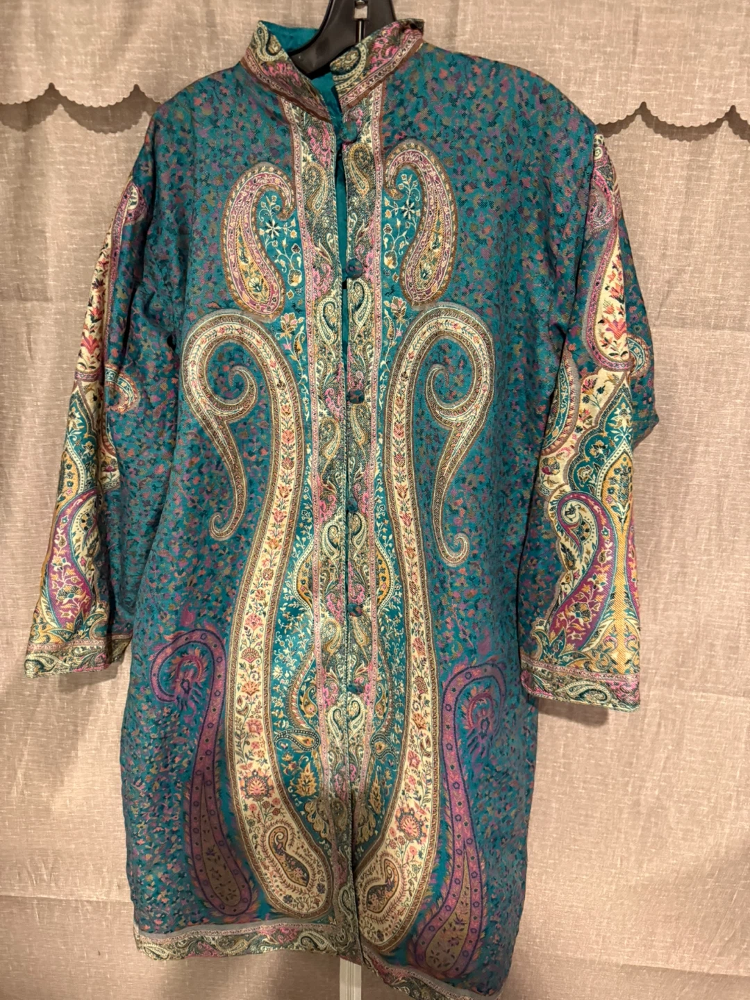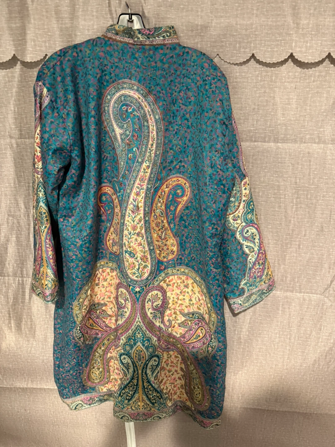 Beautiful paisley print coat! The colours are vibrant and the pattern is eye-catching. It's perfect for adding a unique touch to your wardrobe and staying cozy on cooler days