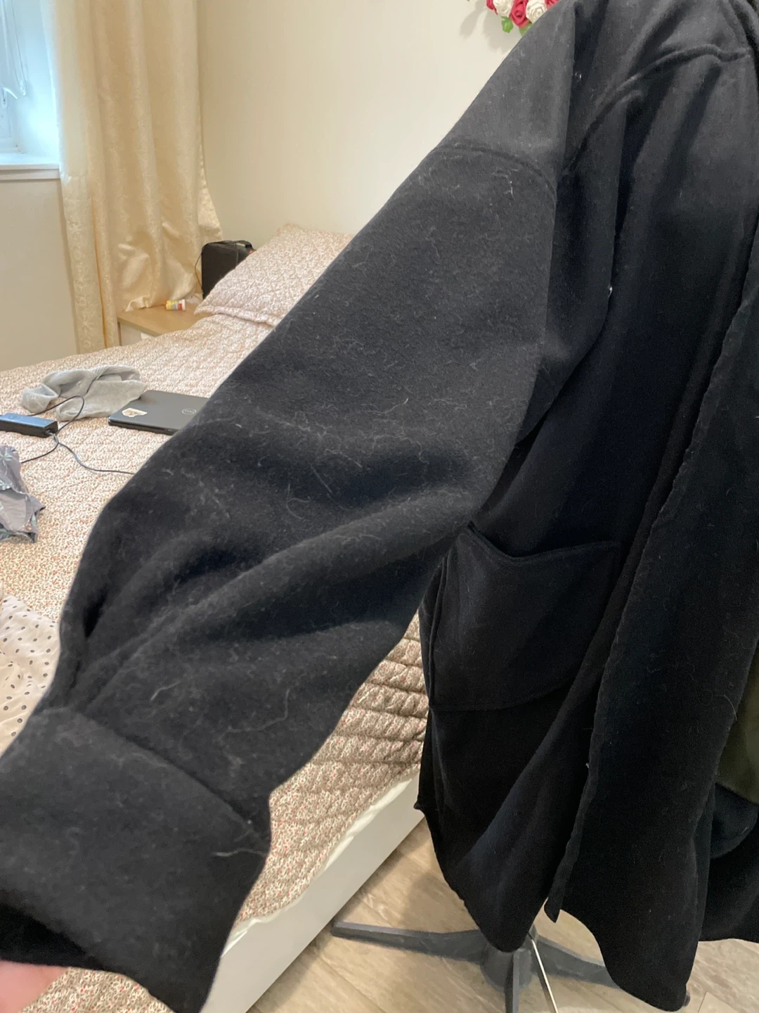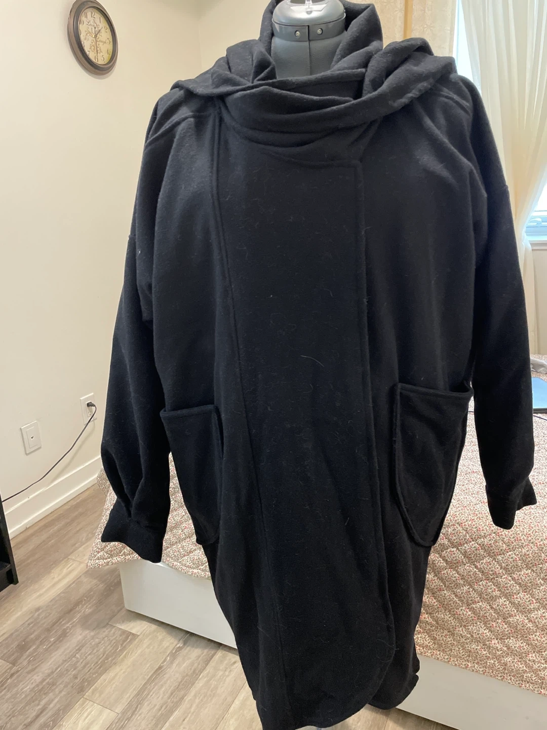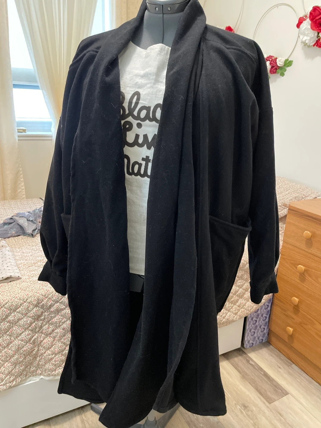 Cozy black cardigan with a shawl collar and front pockets. It's made of a soft, comfortable material, perfect for layering. The design offers a relaxed fit.