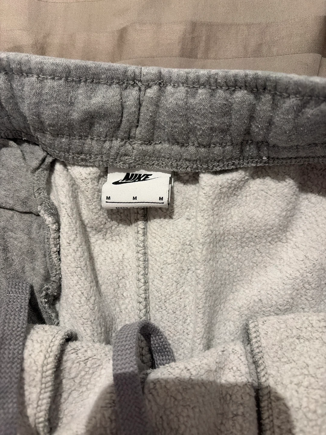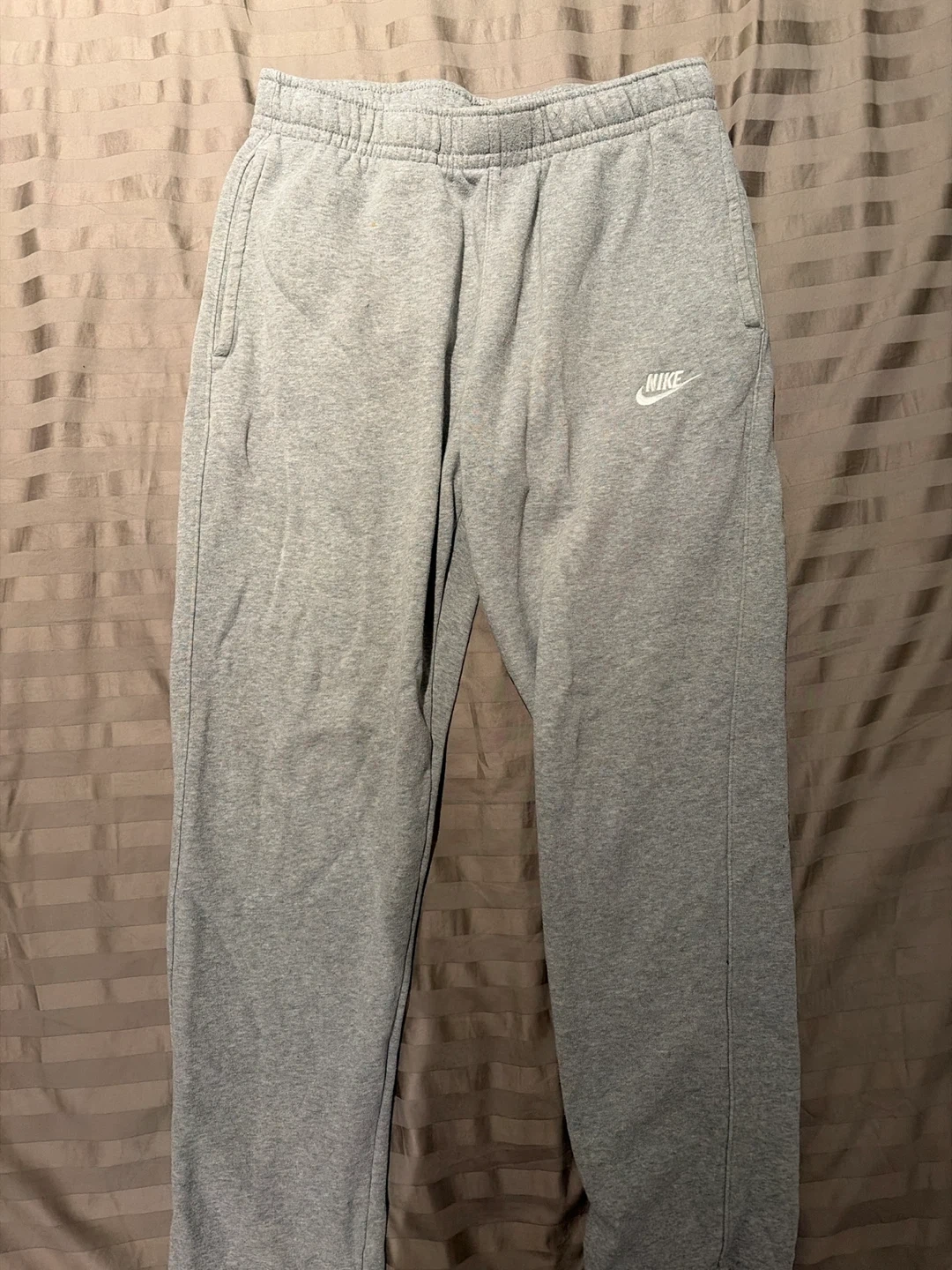 These are Nike grey sweatpants in a size medium. They're made of a soft, comfortable material. These pants are great for casual wear or athletic activities!