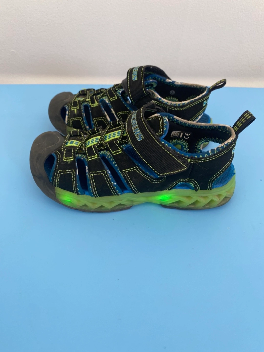Skechers kids' sandals with hook-and-loop closures for easy on and off. These shoes have fun light-up soles that activate with movement. Size 12.