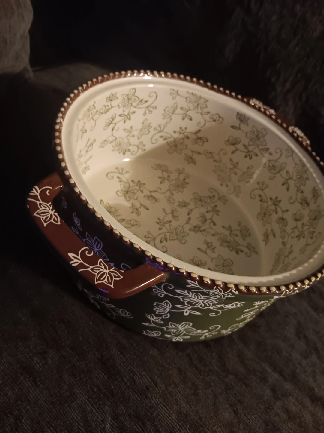 A decorative serving bowl with a floral pattern. It has two handles for easy carrying. Great for serving guests!