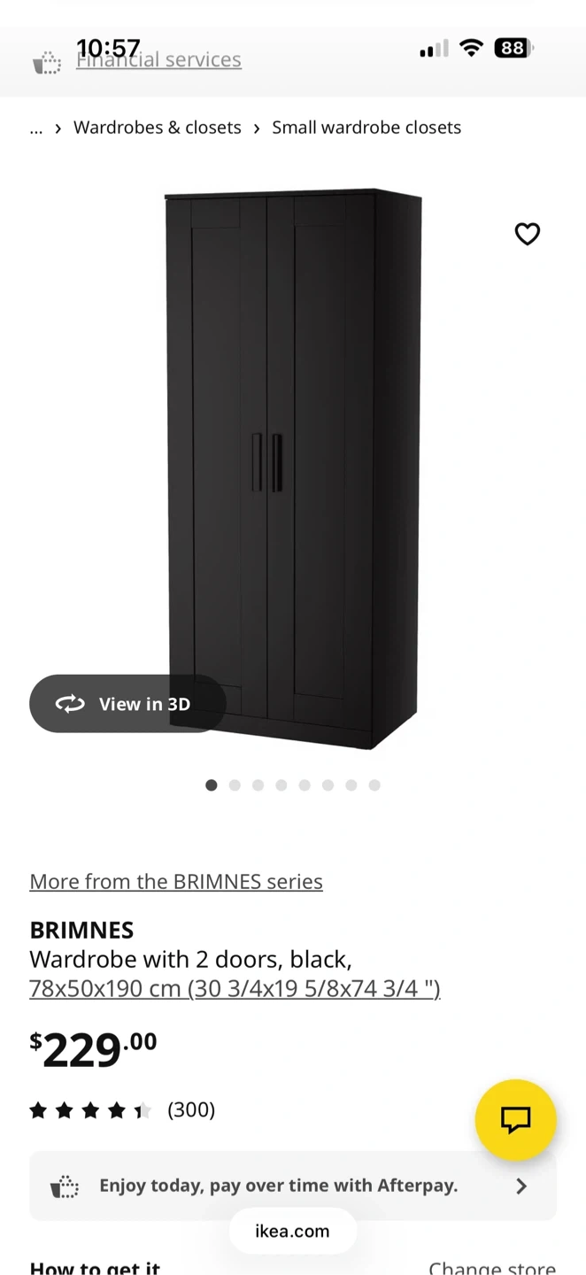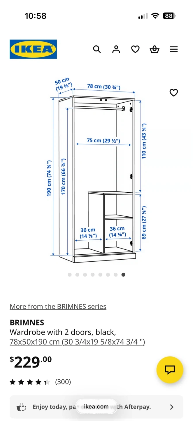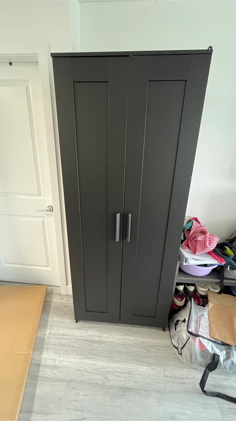 This is an IKEA BRIMNES wardrobe with two doors in black. It measures 78x50x190 cm and includes a hanging rod and shelves. Perfect for storing clothes and accessories! Very clean and came from smoke/pet-free home.