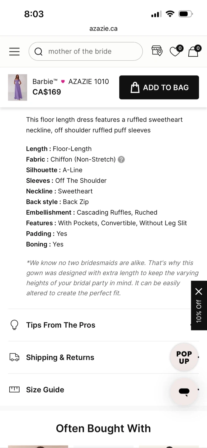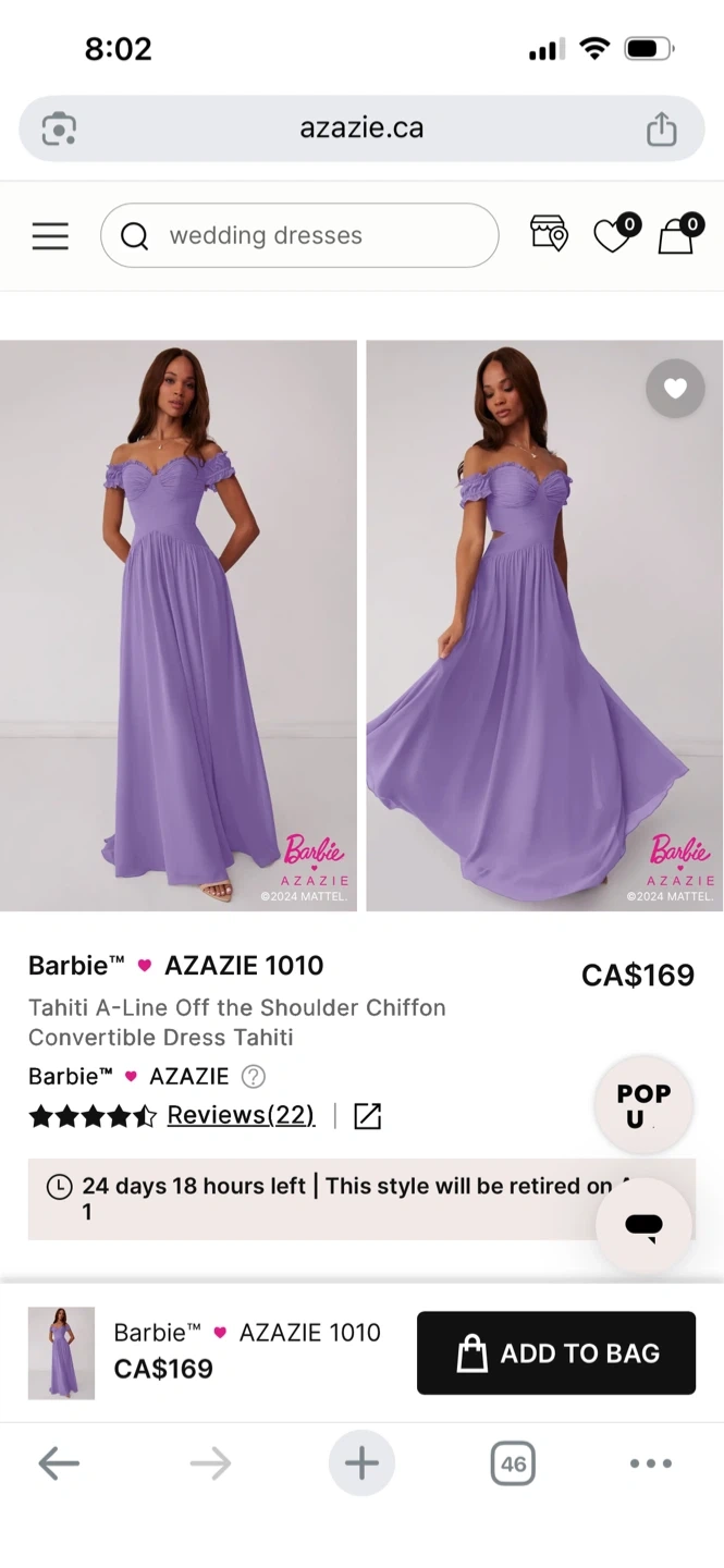 This Barbie x Azazie Tahiti dress features an off-the-shoulder chiffon A-line design. It has a convertible style for versatile wear. Perfect for a wedding or formal occasion!