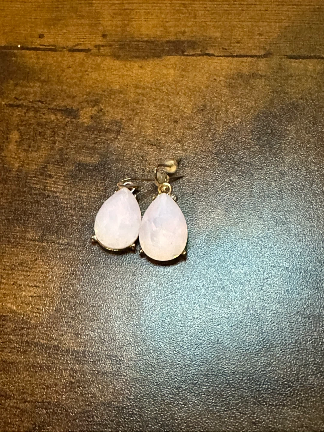 Pair of teardrop gemstone earrings in a light, pearlescent colour. They have a gold-toned setting with a hook backing. These earrings add a touch of subtle sparkle to any outfit.