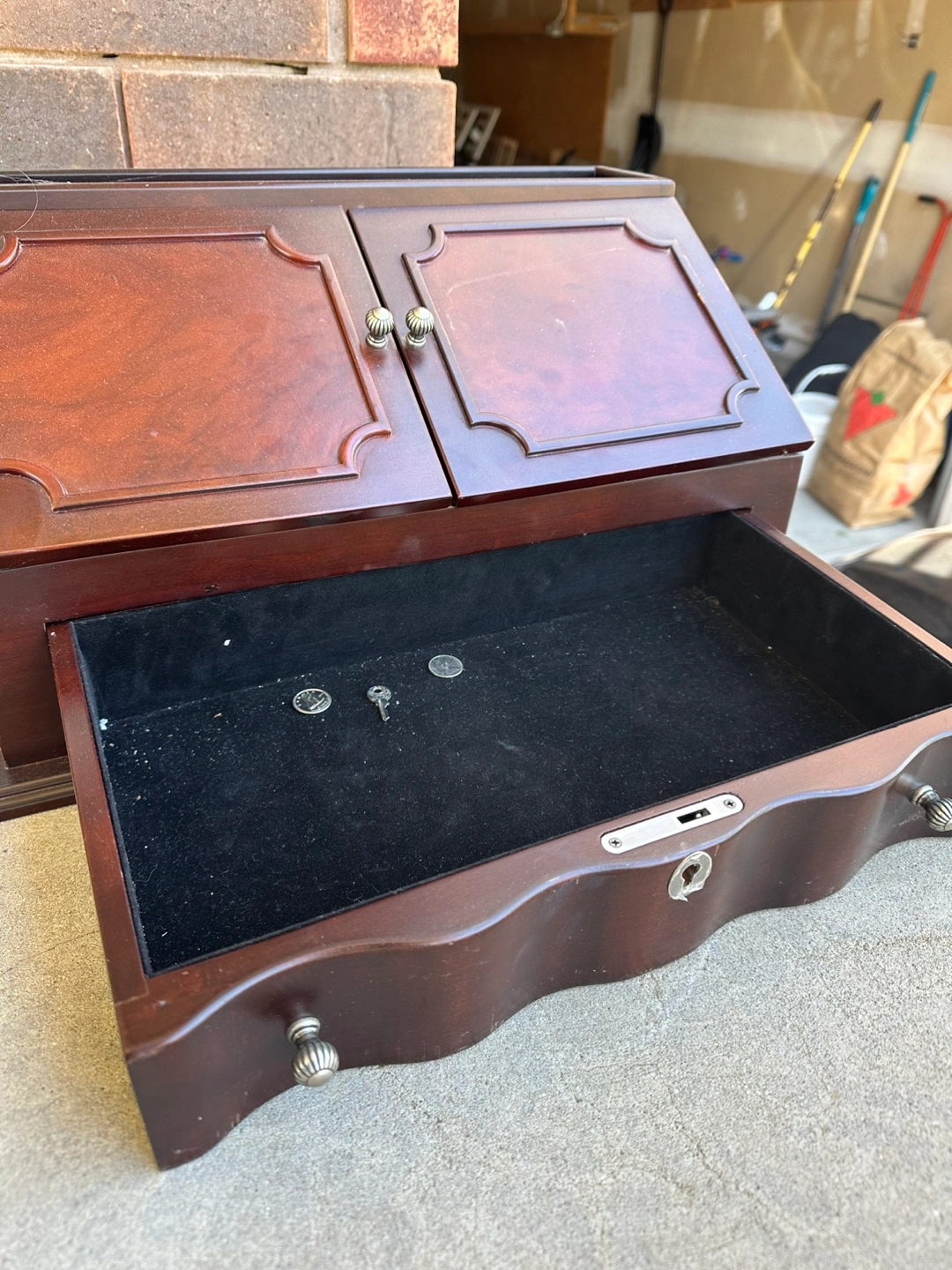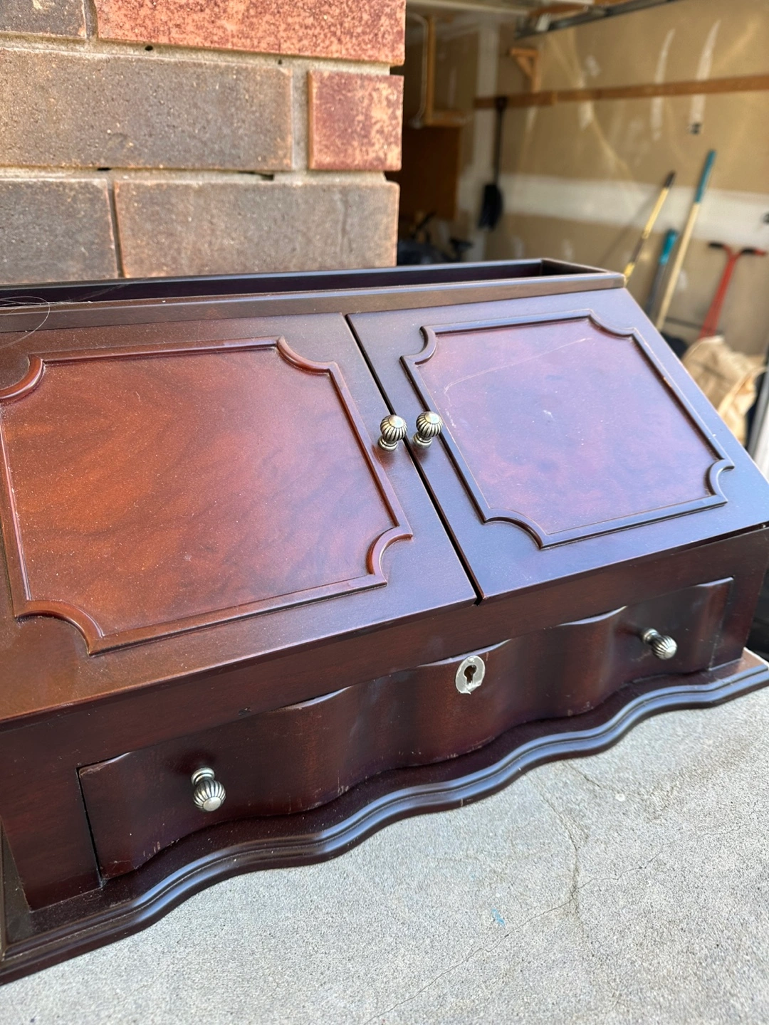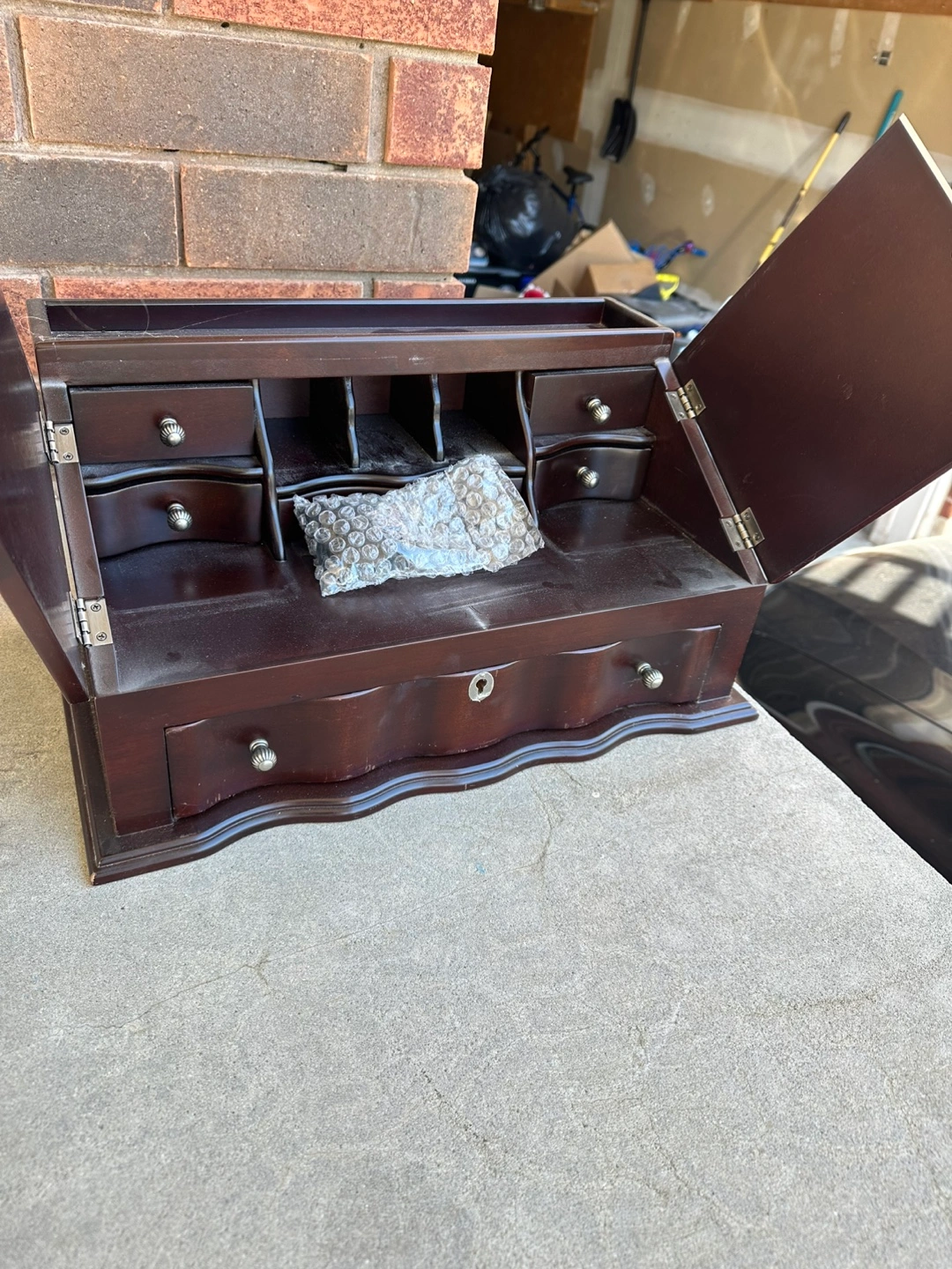 Dark brown wooden jewellery box. Multiple drawers and compartments. Secret compartment. Key included. Wave-like detailing on bottom drawer.