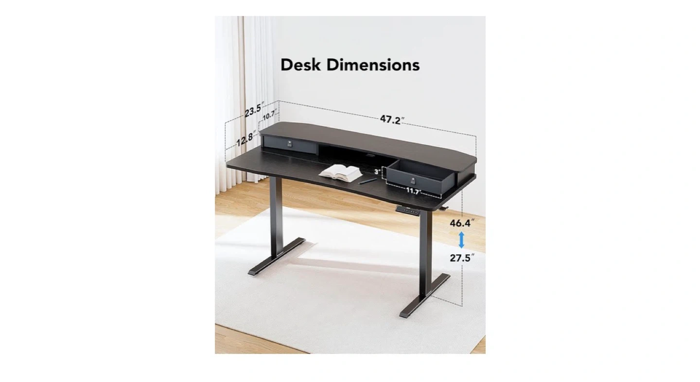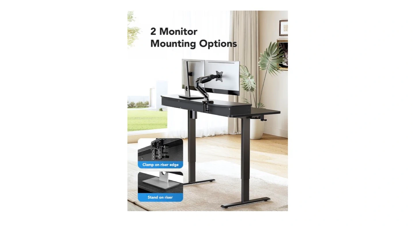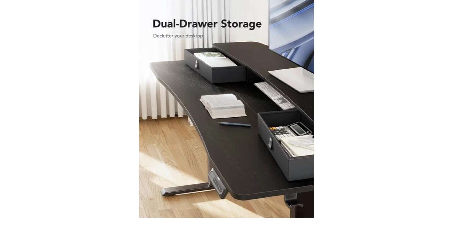 This electric standing desk features a dual-drawer storage system to help declutter your workspace. It offers 2 monitor mounting options and an adjustable height range from 27.5" to 46.4". The desktop measures 47.2" wide.