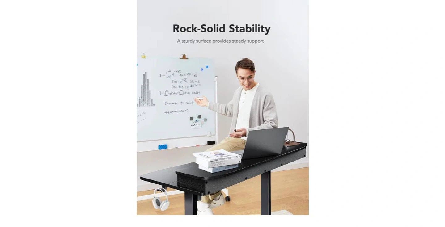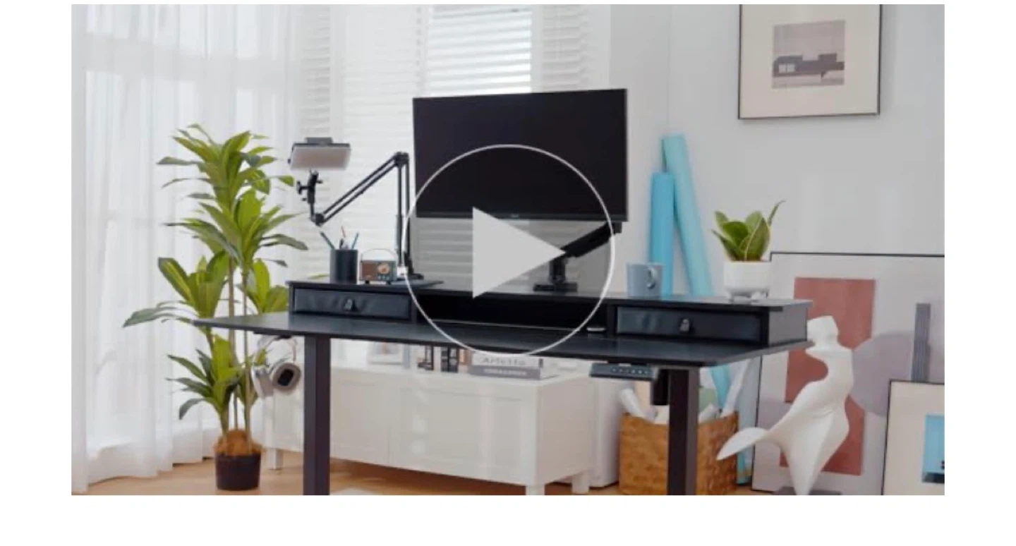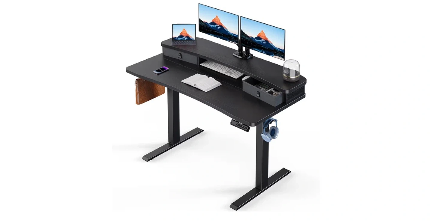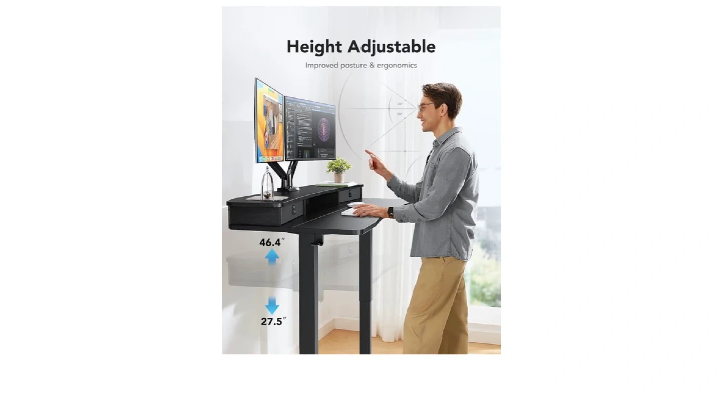 This electric standing desk features a dual-drawer storage system to help declutter your workspace. It offers 2 monitor mounting options and an adjustable height range from 27.5" to 46.4". The desktop measures 47.2" wide.