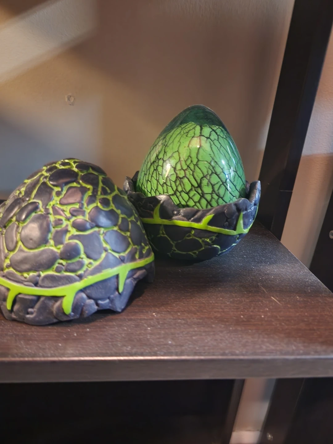 Each egg is designed with a cracked, lava-like texture in black and neon green. Great for display or fantasy-themed decor. The green egg sits in a small, rocky base.