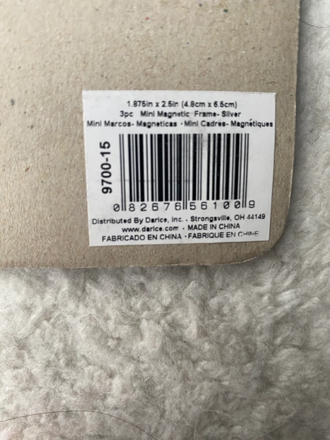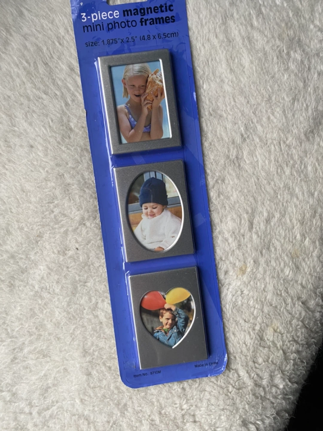 Set of three mini magnetic photo frames. Each frame fits photos measuring 1.875" x 2.5" (4.8 cm x 6.5 cm). Frames are silver coloured and magnetic.