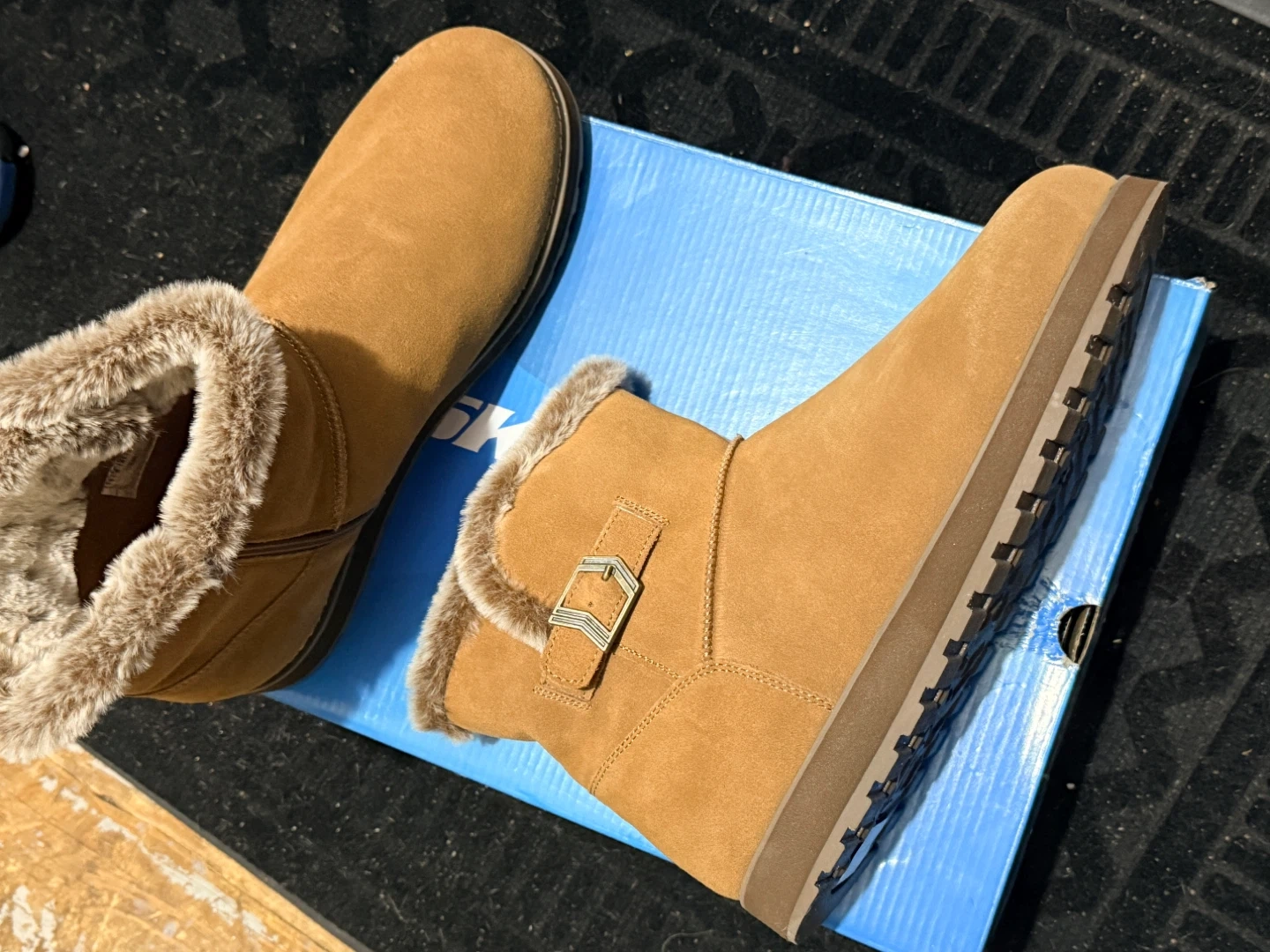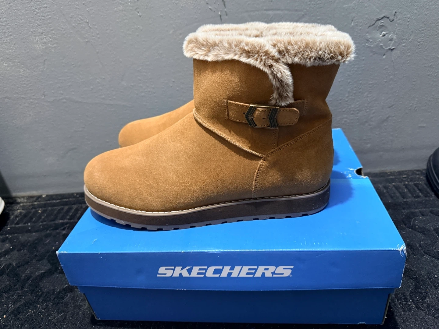 These Brand New never worn Skechers women's boots are in great condition and come with the original box! They are a women’s size 11 and feature a wide width for extra comfort. The colour is a lovely chestnut brown, perfect for the colder weather. The model number is 8888389/CSNT.
