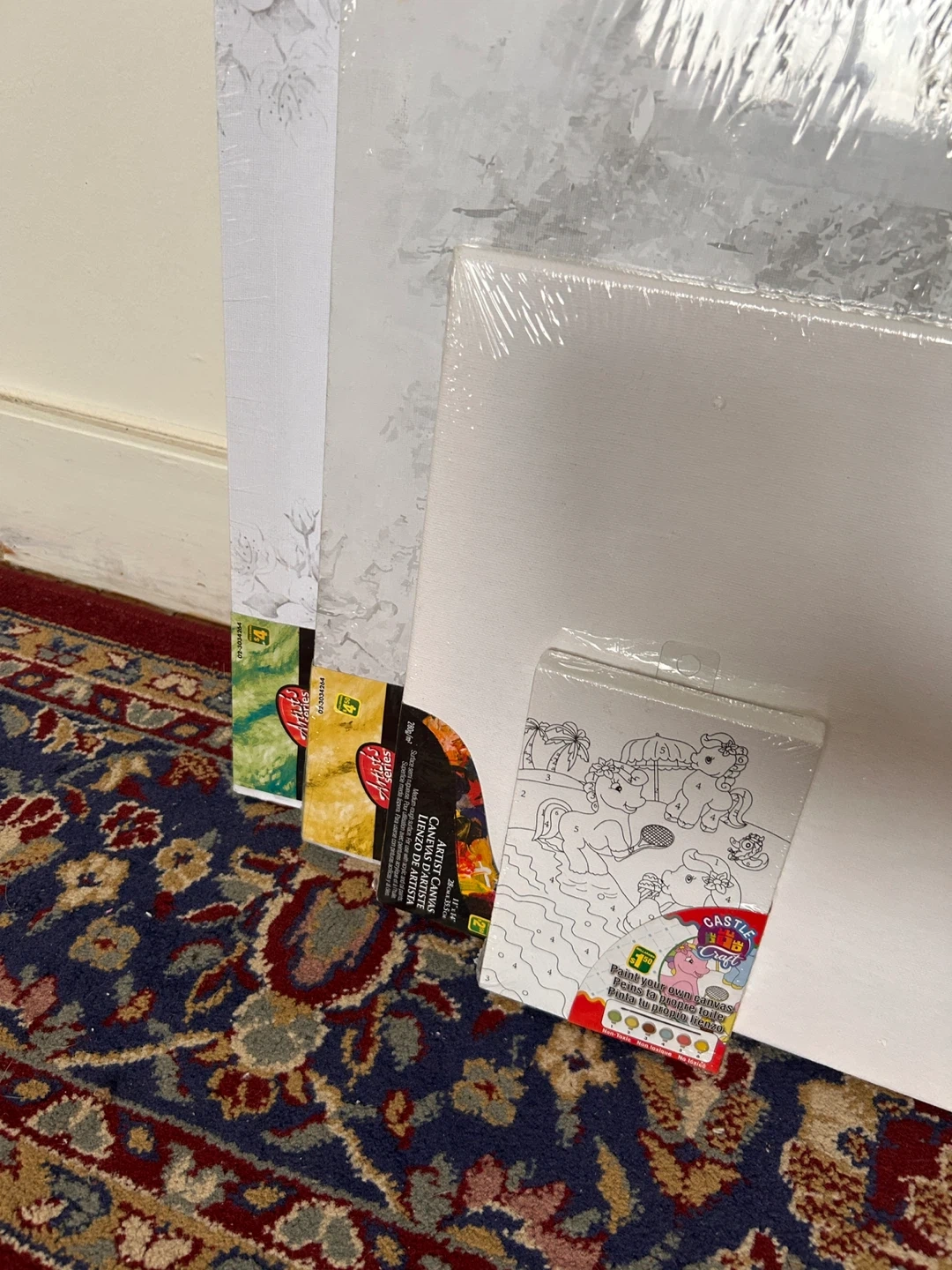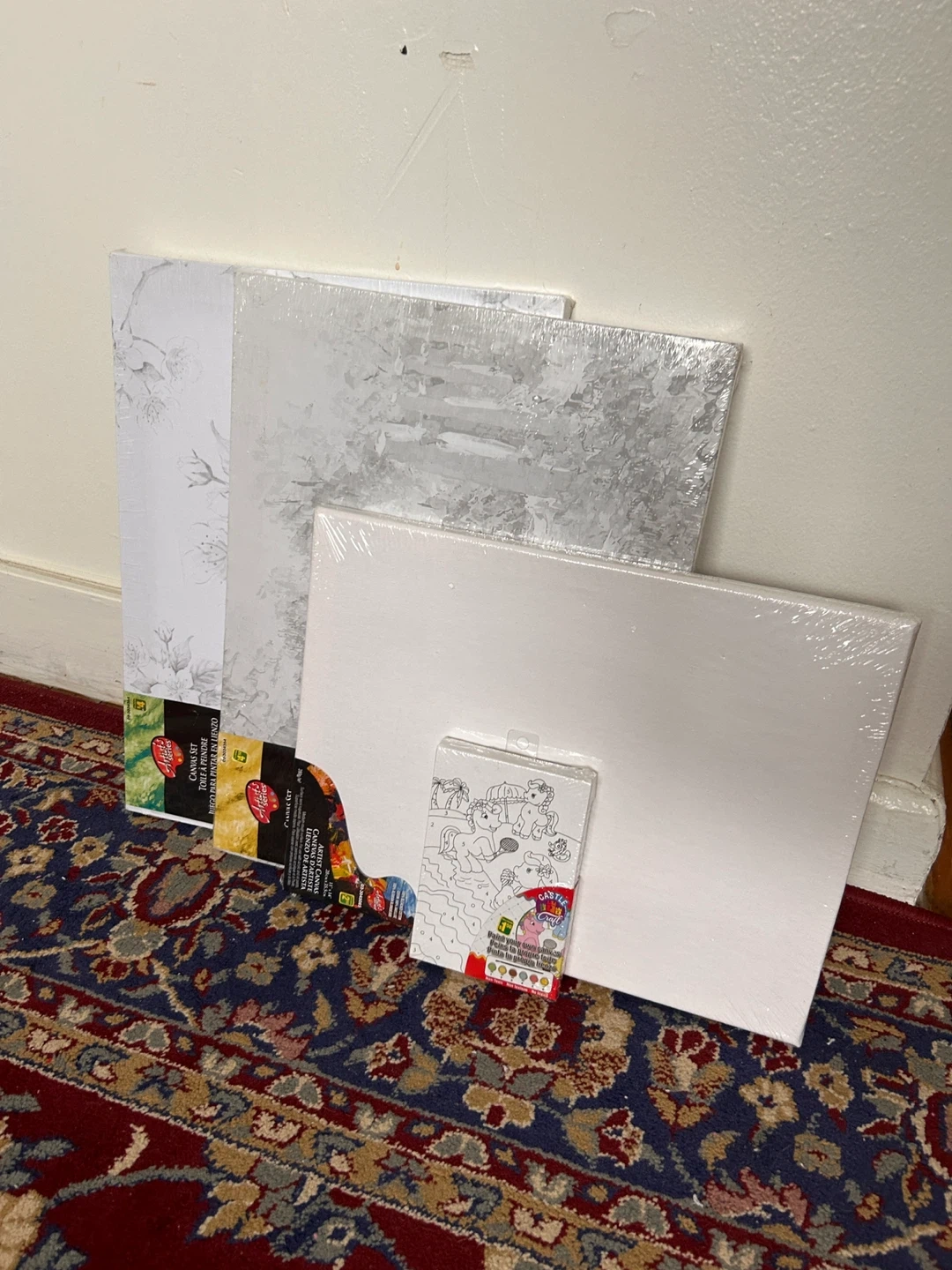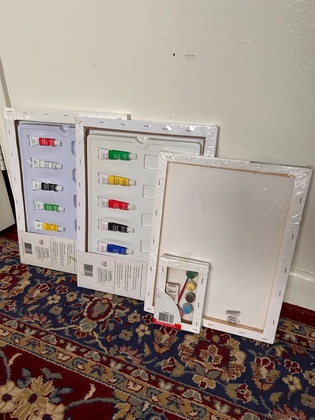 Includes multiple pre-printed canvases and acrylic paint tubes. Surface is medium-rough, suitable for acrylic and oil paints. Great for aspiring artists!