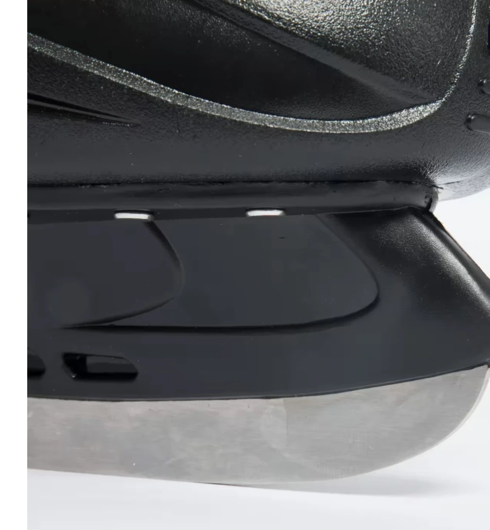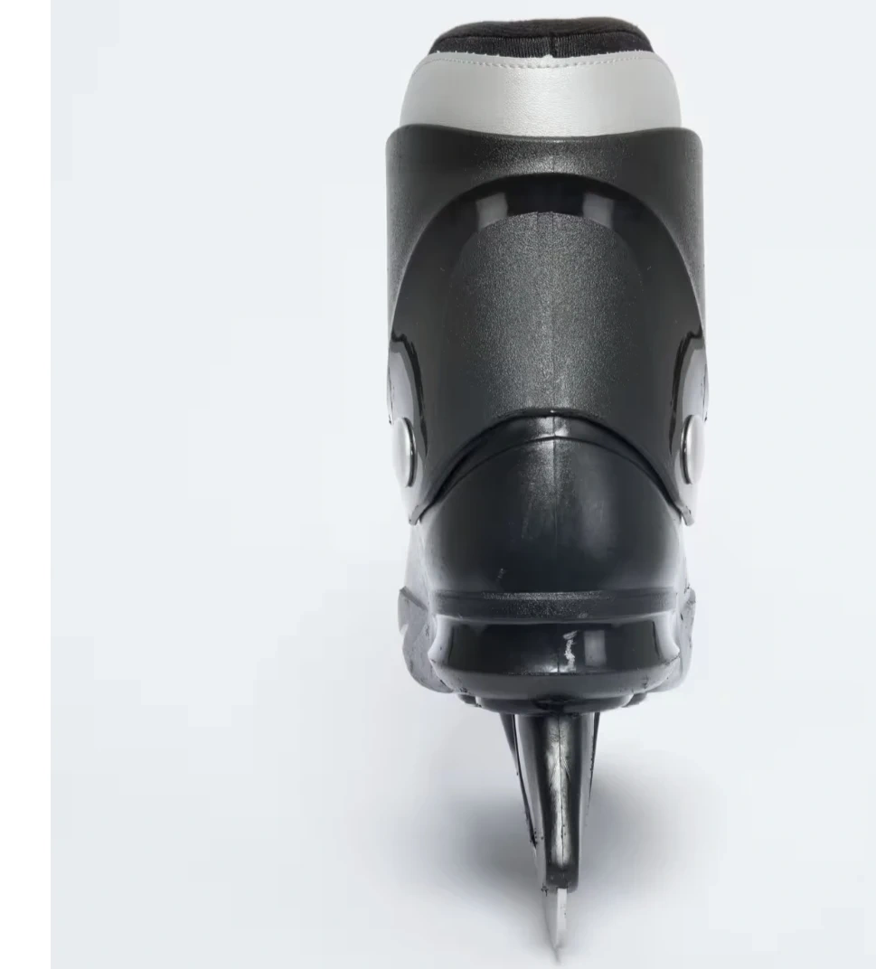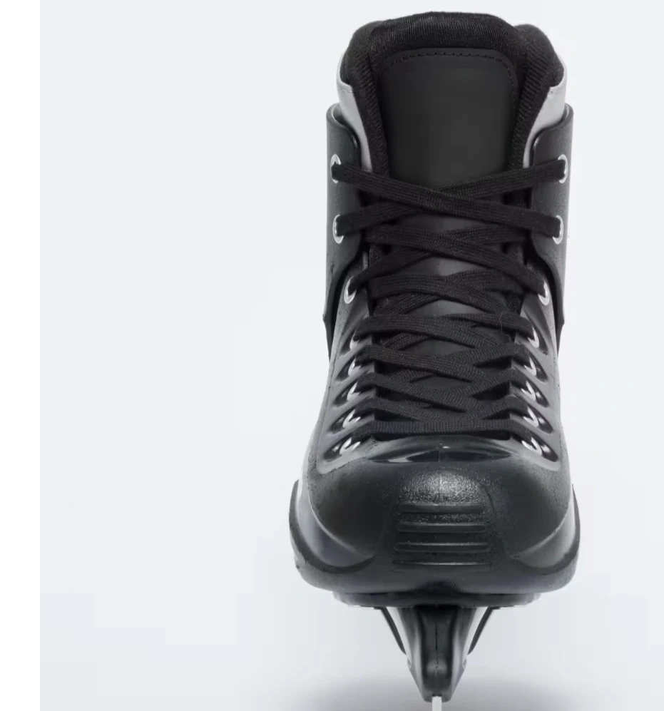 These are black ice skates. They feature a supportive boot and laces for a secure fit. Blades are made of stainless steel.